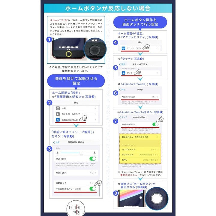 また商品ページに記載のスマホ設定「機体を傾けて起動させる設定」「ホームボタン操作を画面タッチで行う設定」を併用していただくことで操作性が向上します。