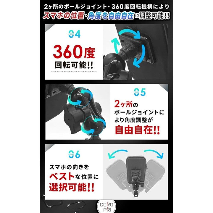「位置・角度調整が自由自在」バイカーにお馴染みのアーム式ボールジョイント機構を採用することで、ケースの位置・角度の調整や着脱が簡単にできます。。スマホの向きをベストな位置に選択可能です。