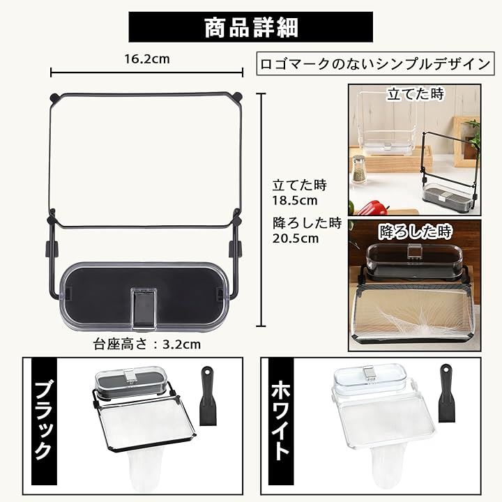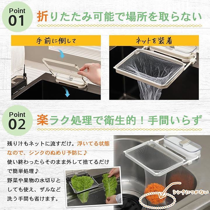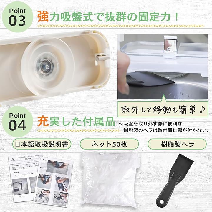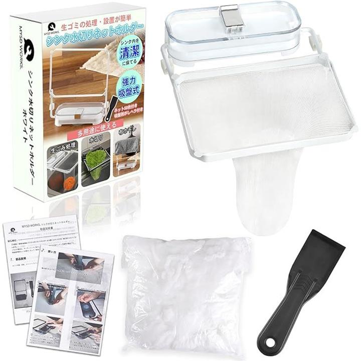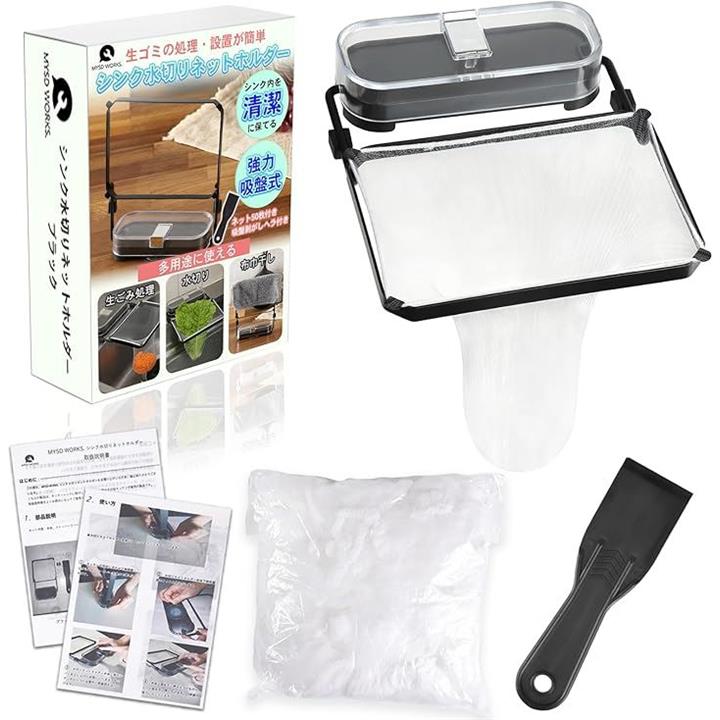 互換品 シンク水切りネットホルダー 強力吸盤 吸盤はがし用樹脂製ヘラ付き 日本語取扱説明書付き ネット50枚付 ブラック/ホワイト キッチン用品 三角コーナー いらず 排水溝ネット 生ごみ入れ