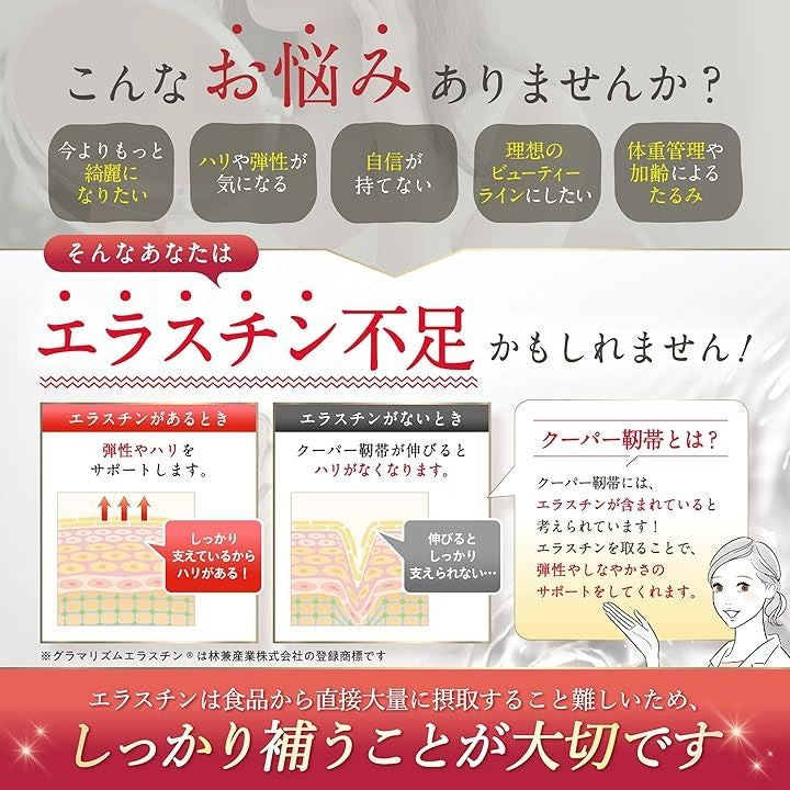 「医師監修xグラマリズムエラスチンを一粒あたり75,000μgと贅沢配合」コラーゲン繊維を支える役割を持つといわれているエラスチン。