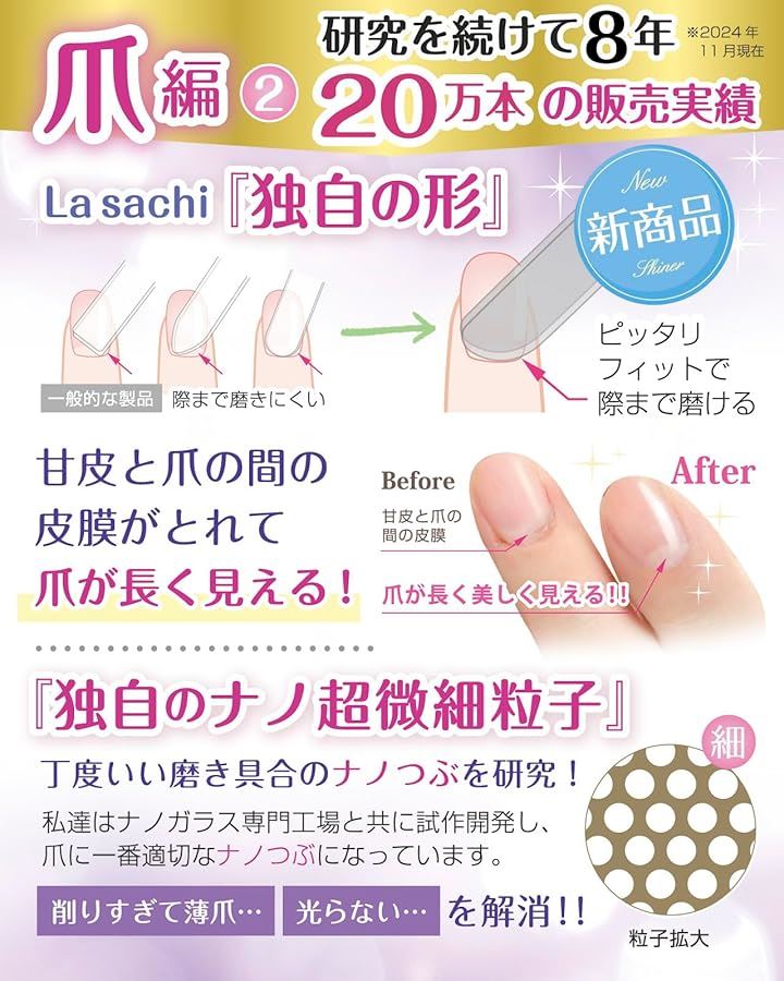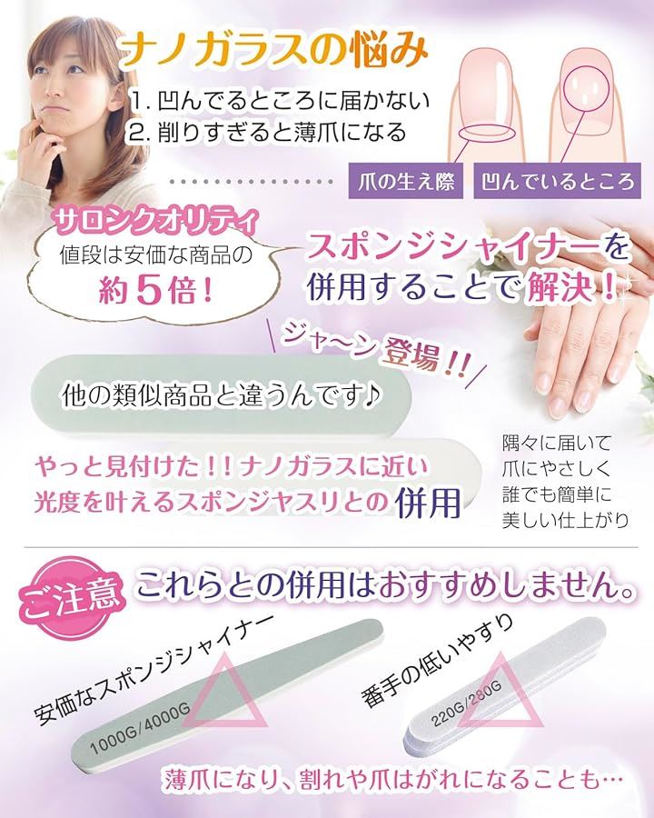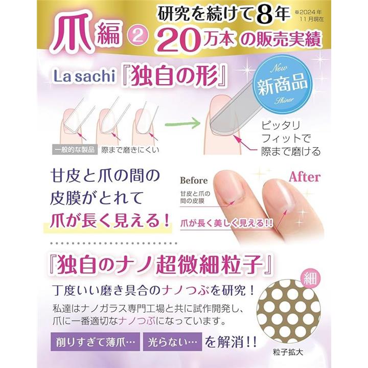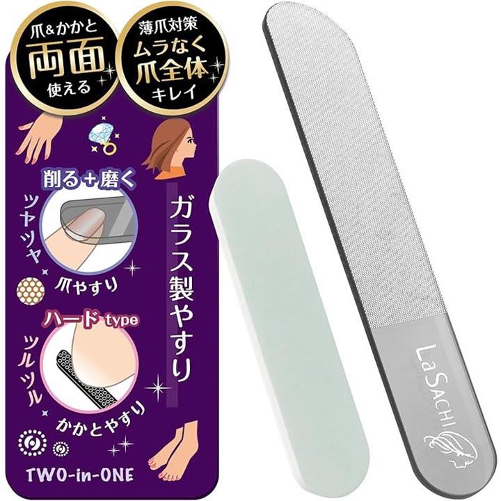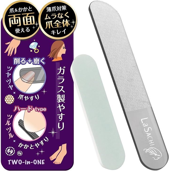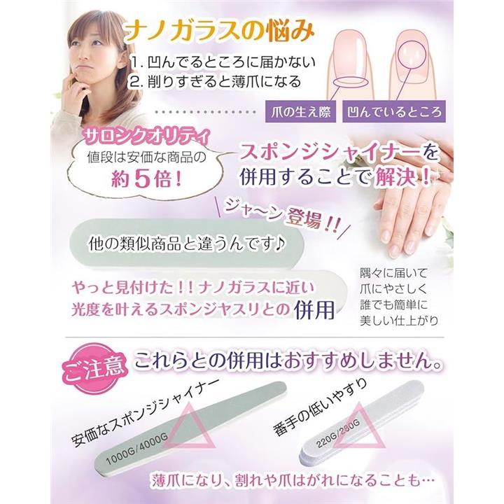傷と薄爪にならない、とぅるんと美しい艶 爪やすり + かかとやすり 両面 ナノ ガラス製 爪磨き ピカピカ 角質除去 踵 つるつる ネイル ケア シャイナ― 縦シワにも届く高光沢スポンジ 付き