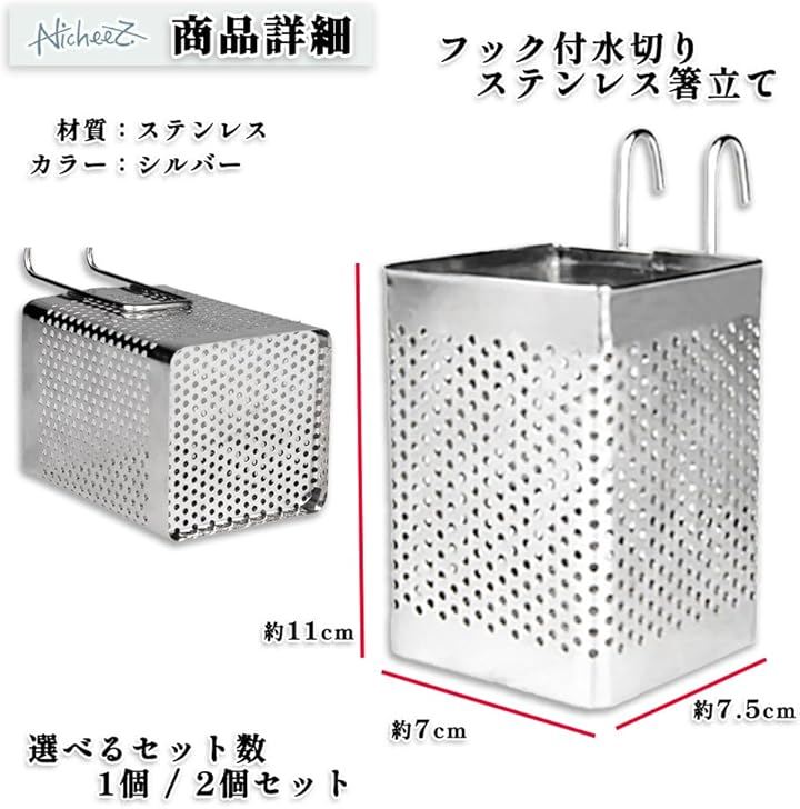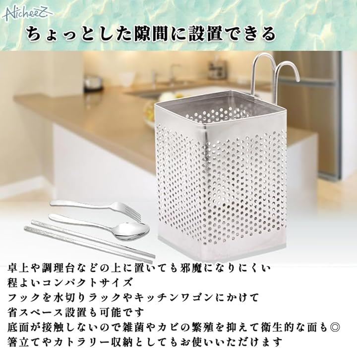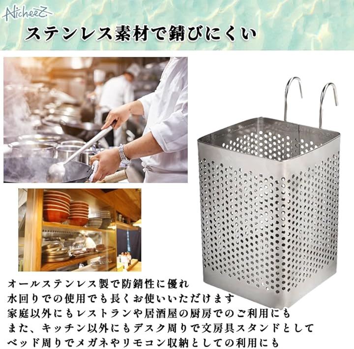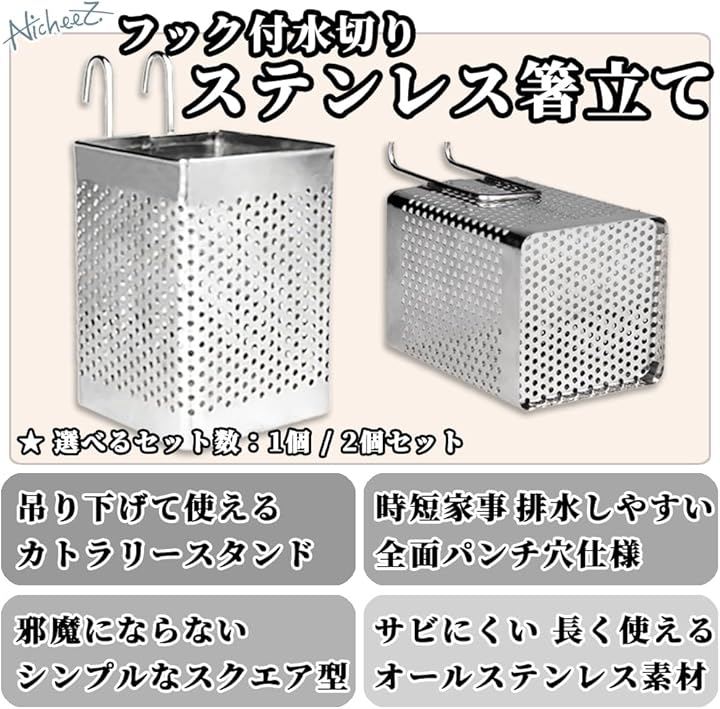 箸立て 水切り ステンレス カトラリー スタンド 吊り下げ フック付 パンチング キッチン ツール 収納 四角