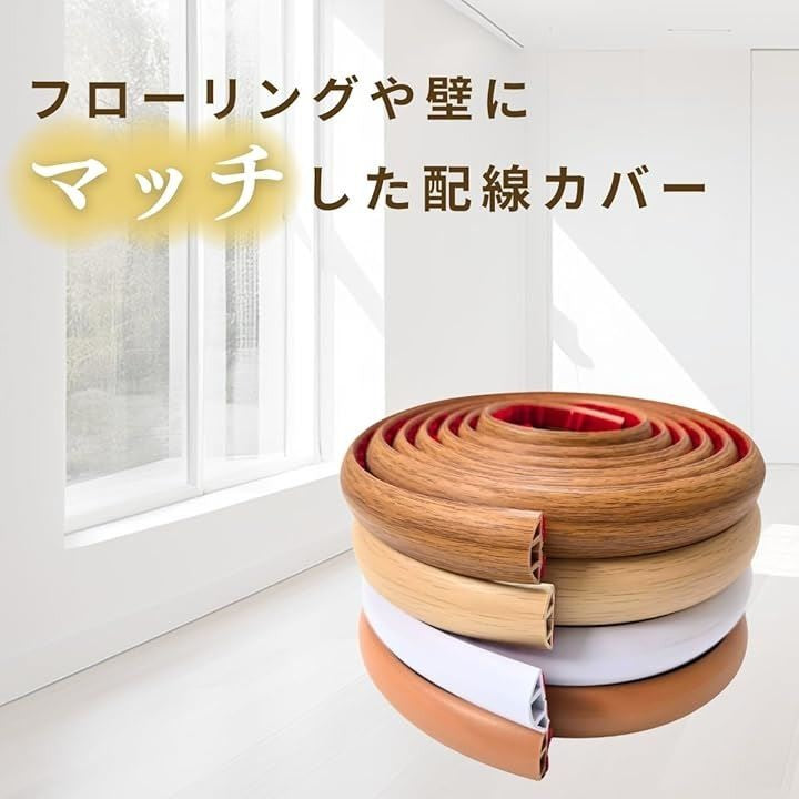 「配線カバーに見えない。室内インテリアと調和するカラー設計」 リビングのフローリングや木目の家具、白壁にもなじみやすい、選べるナチュラルカラーも採用。