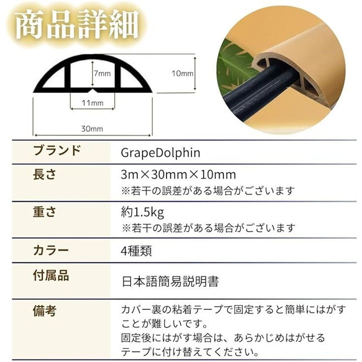 GrapeDolphin 配線カバー 配線隠し ケーブル カバー コード モール 床 木目 ペット 子供 いたずら対策 ハサミで切れる 3mx30cmx10mm (ナチュラル) |
