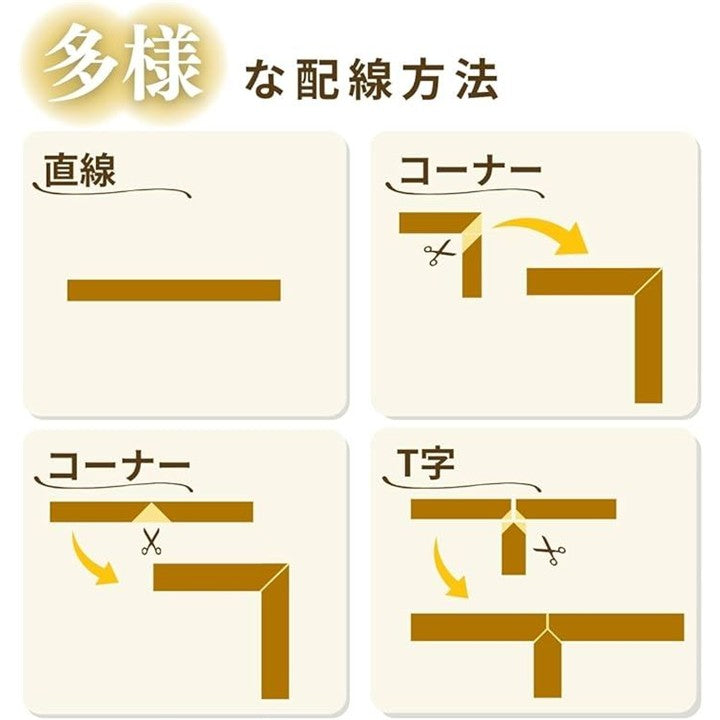 「複雑な配線にも対応|T字・角・直線すべてOK」 デスクやテレビ周辺、壁沿いの配線も、T字分岐・曲線・直線など自在にレイアウト可能。