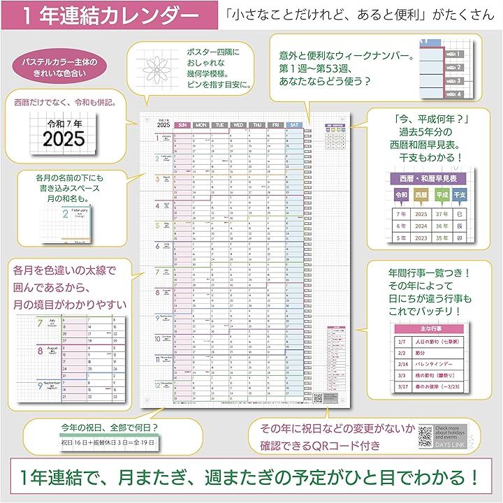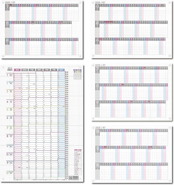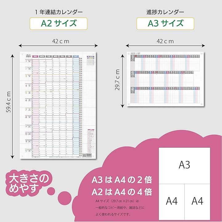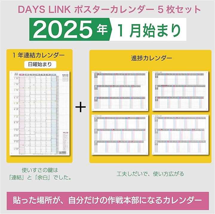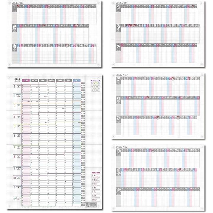 1年連結カレンダー & 進捗カレンダー ガンチャート 家族カレンダー 2025年 1月始まり日曜始まり 大きい 壁掛け A2 A3