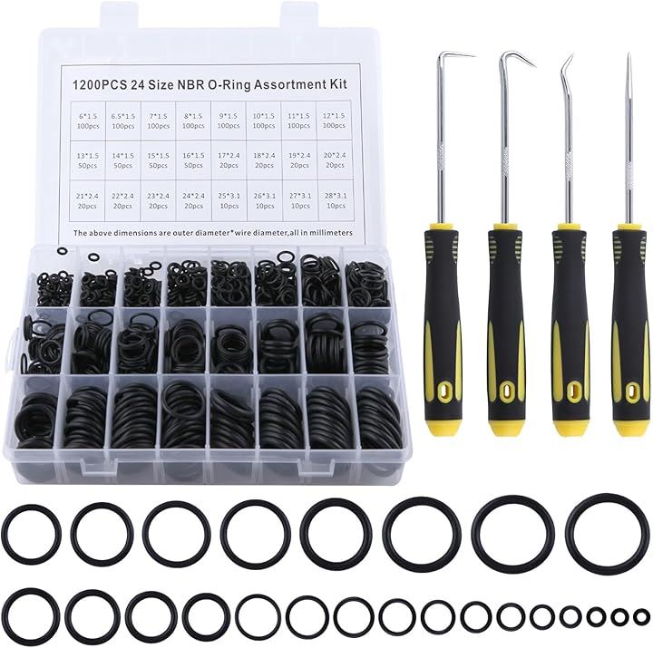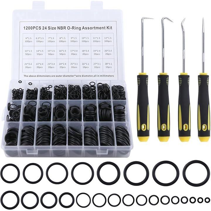 互換品 Oリング セット 24種 径6-28mm 1200個入り ピックフックセット 4種セット ゴムオーリングセット ゴムパッキン 水周り 耐油 耐摩耗 耐熱 耐水 水道 工業用 汎用 精密 オイルシールリムーバー 便利工具 機械修理 収納ボックス付き