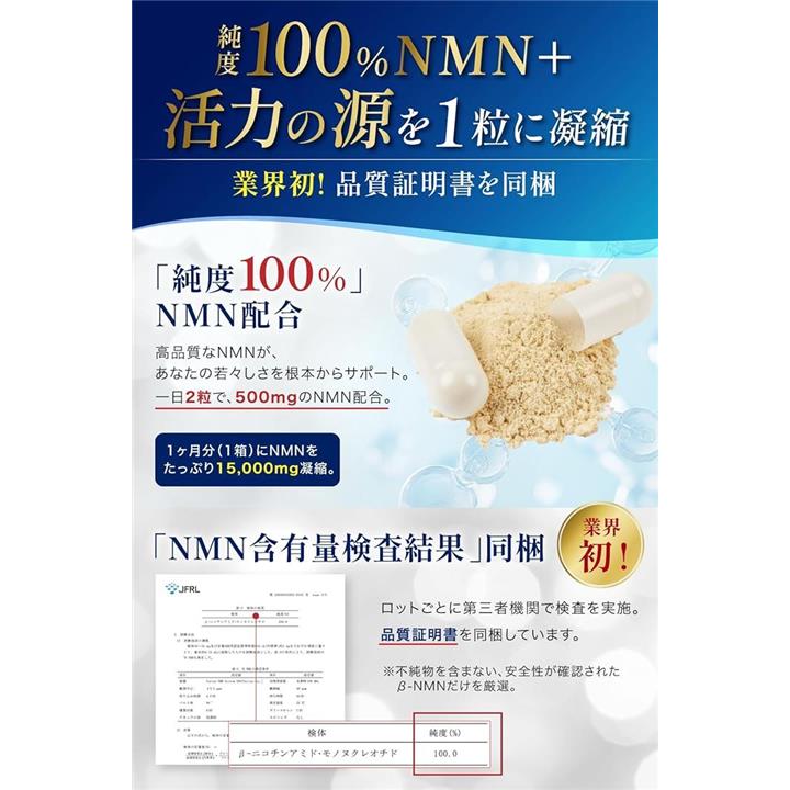 NMN 15000 premium シリーズは、それらの分析はもちろん、製造ロットごとに成分検査を実施しており、品質管理を徹底している信頼性の高いNMNです。