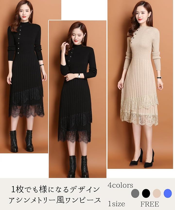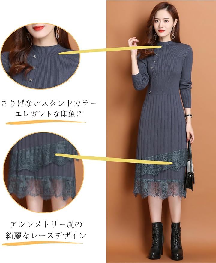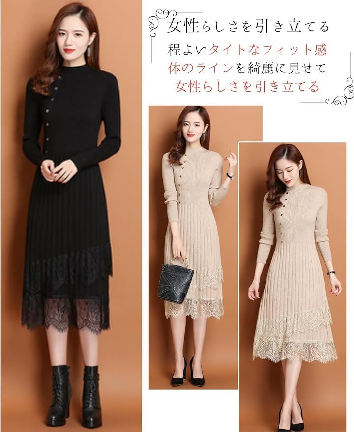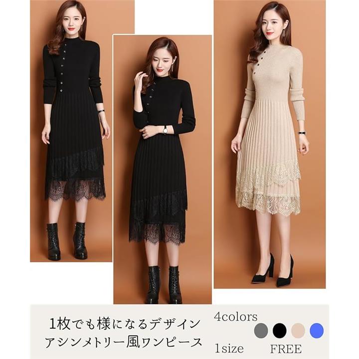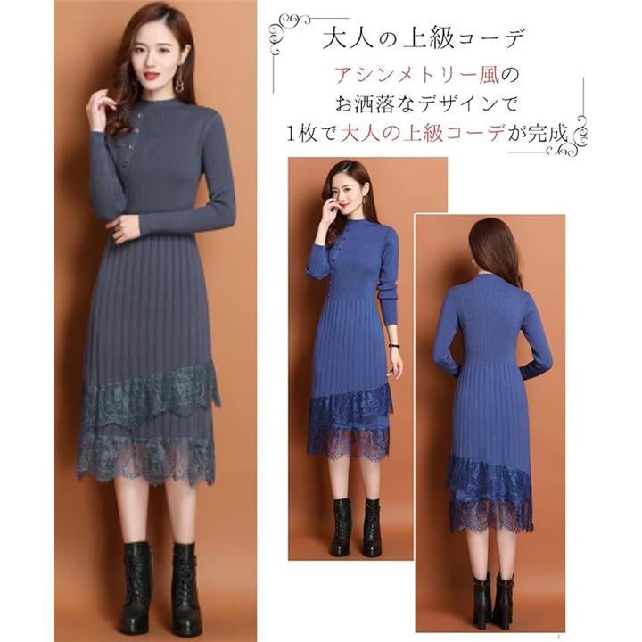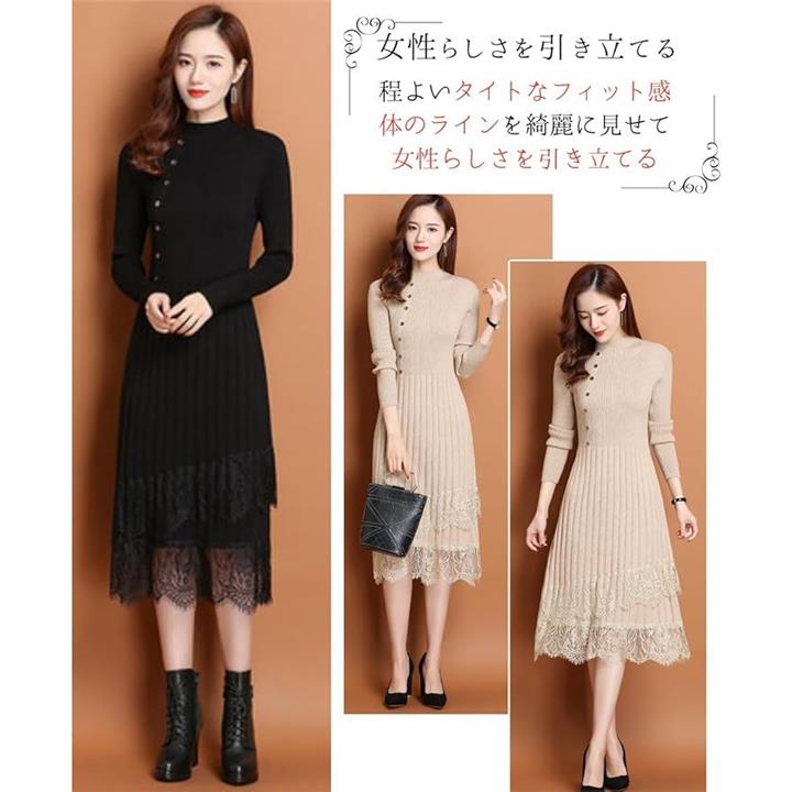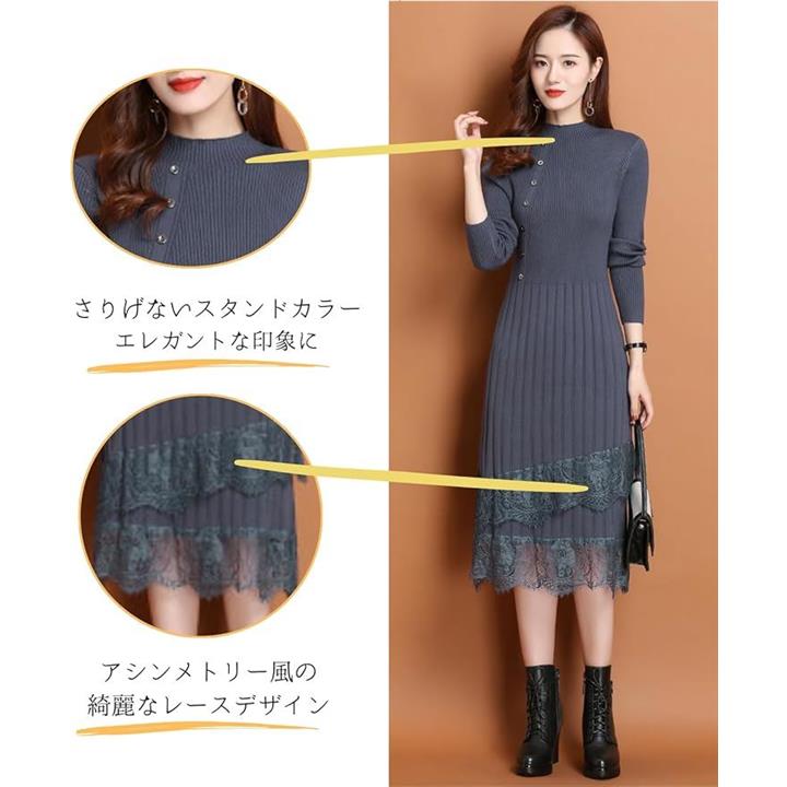 大人可愛い ニットワンピース ロング 長袖 レディース パーティードレス きれいめ タイト レース トップス 上品 清楚 膝下丈 春 秋 冬