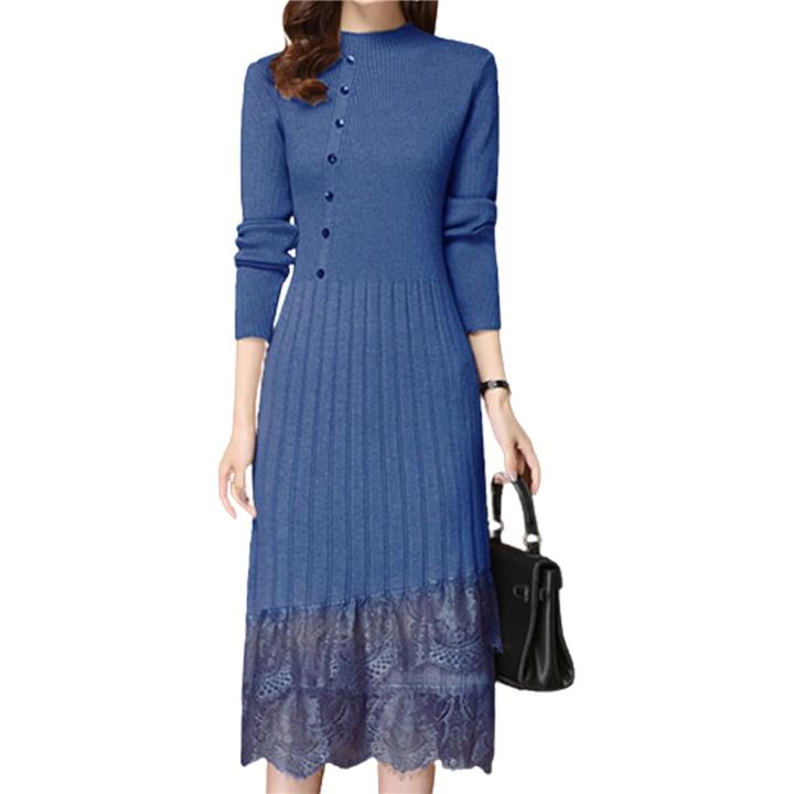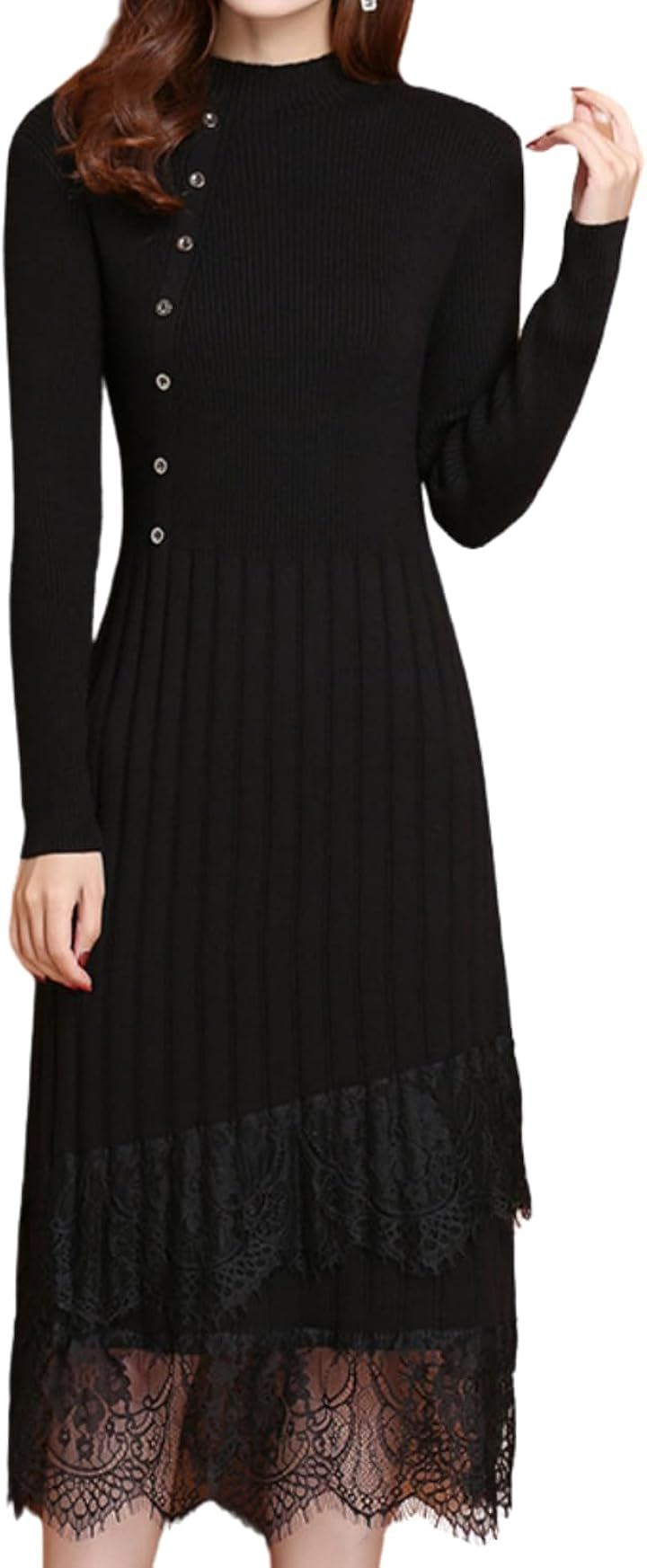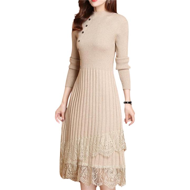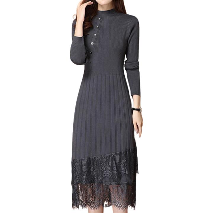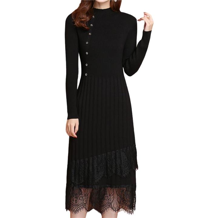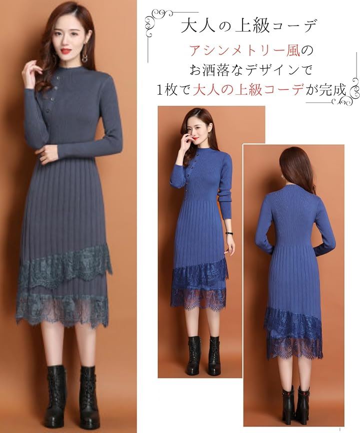 大人可愛い ニットワンピース ロング 長袖 レディース パーティードレス きれいめ タイト レース トップス 上品 清楚 膝下丈 春 秋 冬