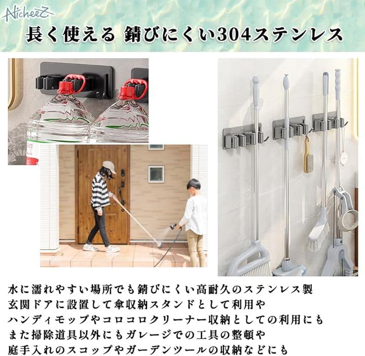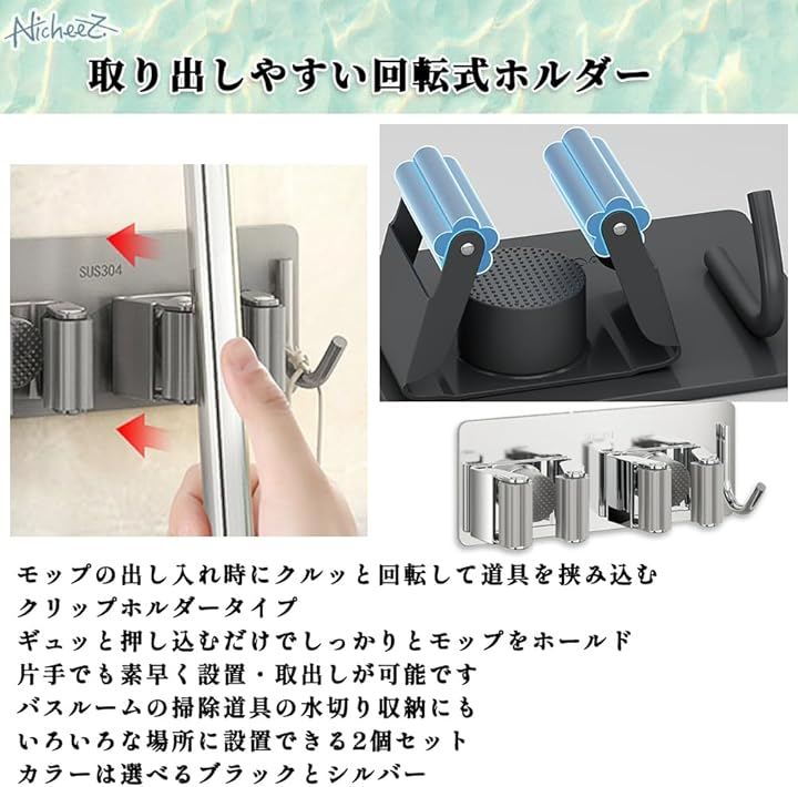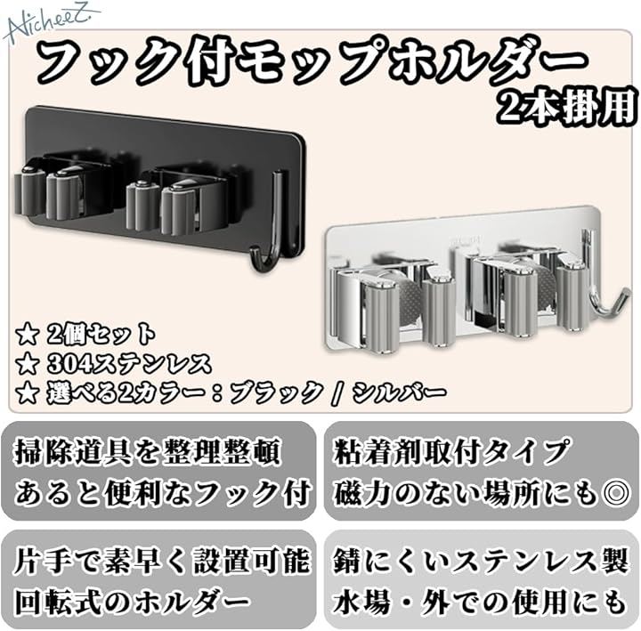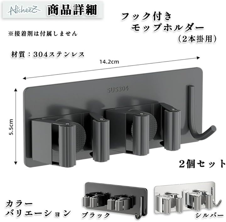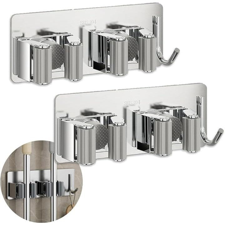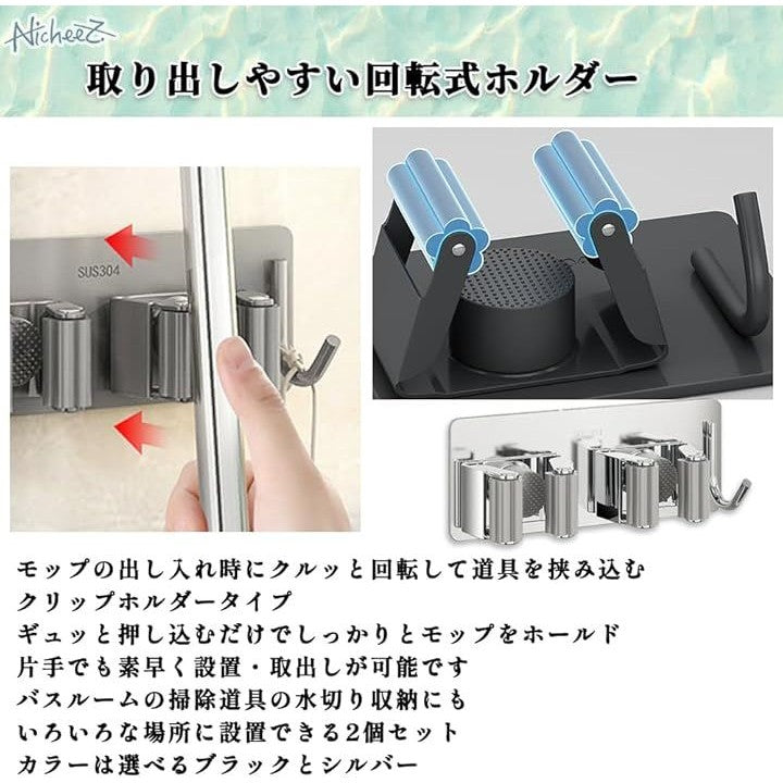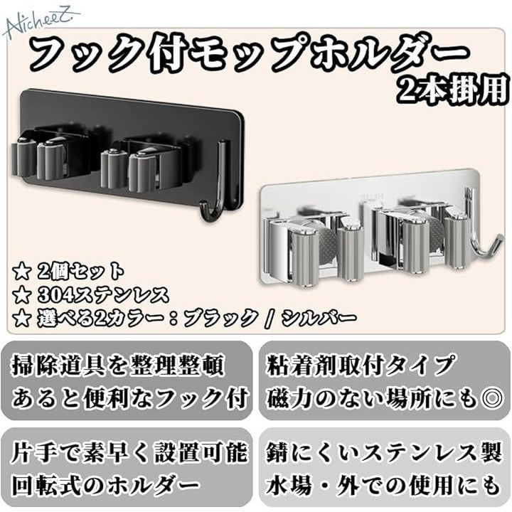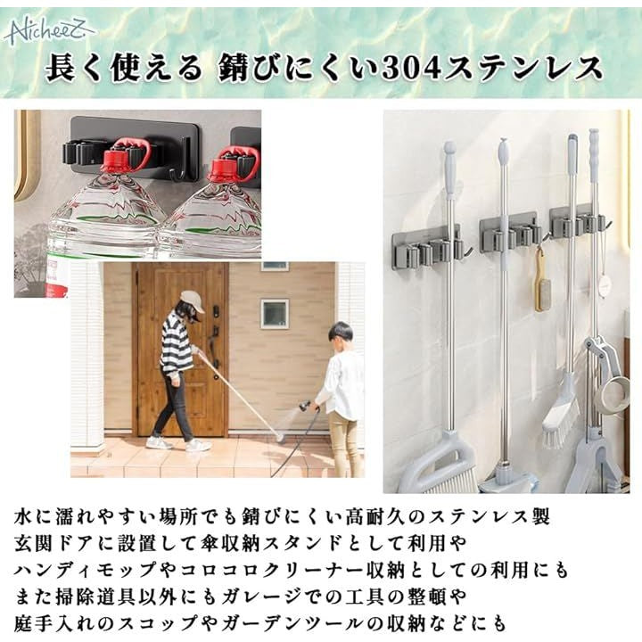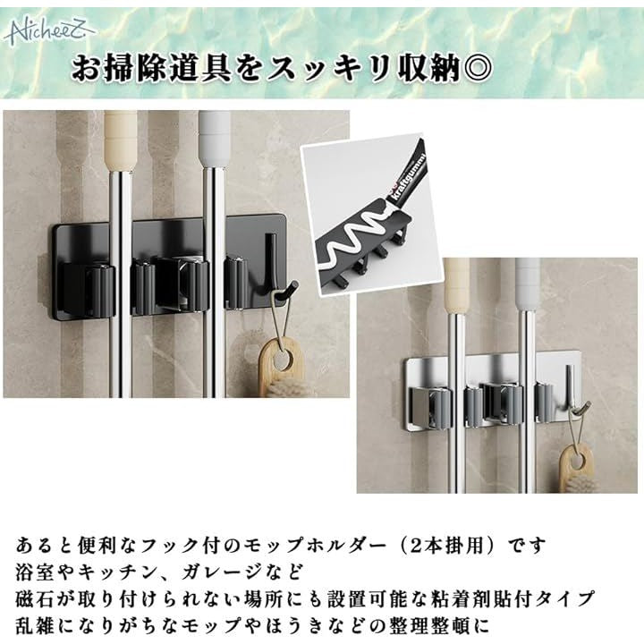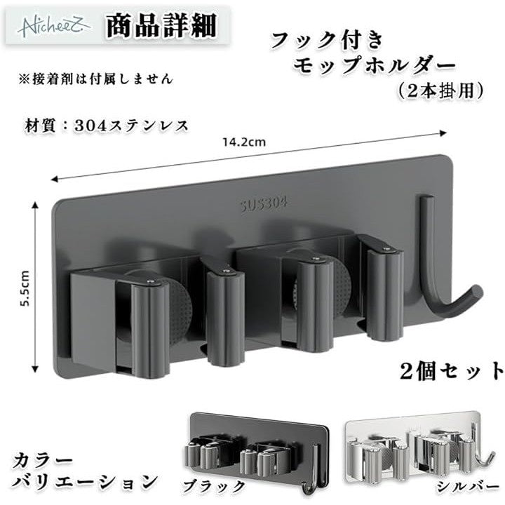 モップホルダー ほうきホルダー フック付 ステンレス製 穴あけ不要 壁掛け ハンガー クリップ 掃除 用具 収納 傘立て 2本用 2個セット