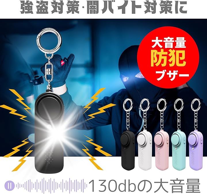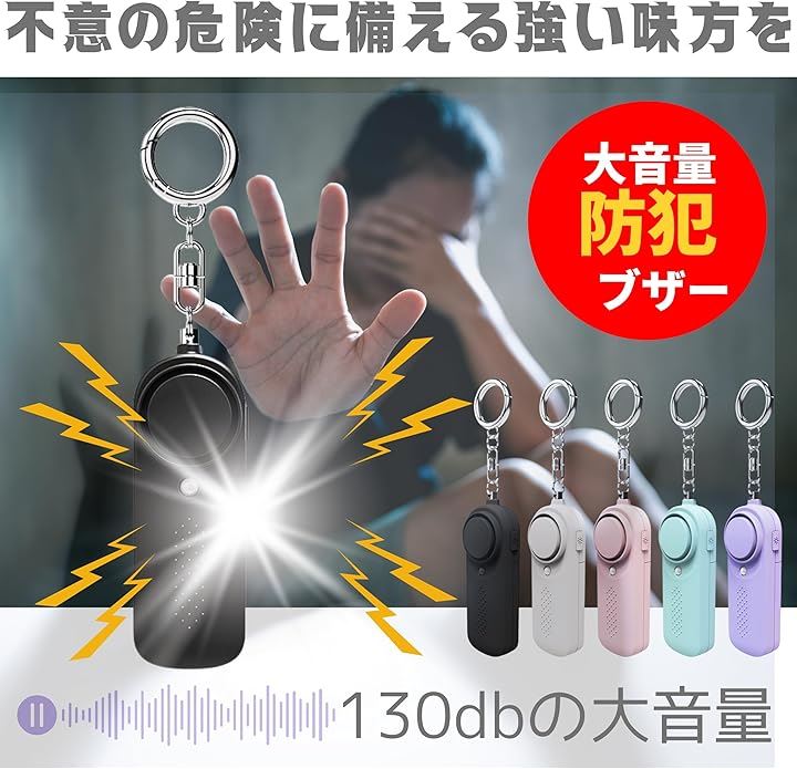 「超大音量130dB防犯ブザー」 130dBの大音量で、遠くにいる人にも危険を知らせることができます。