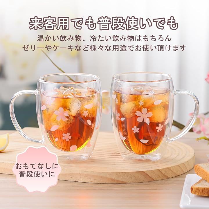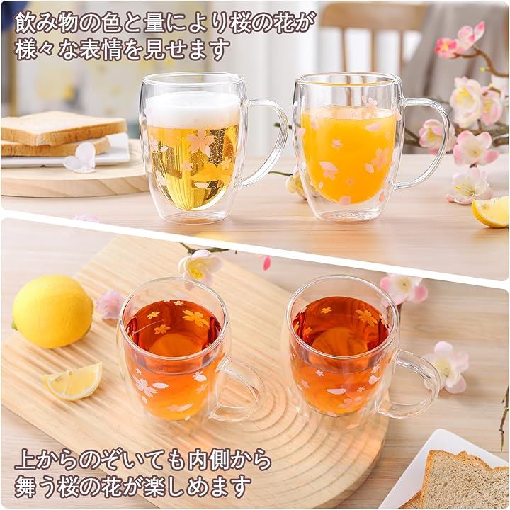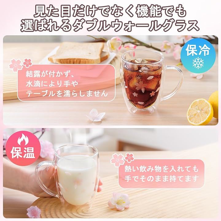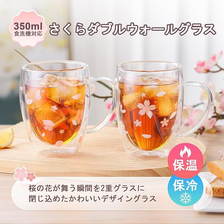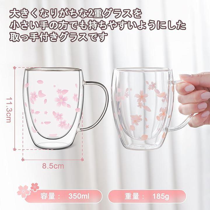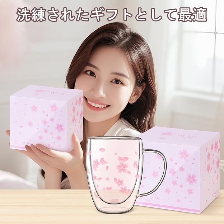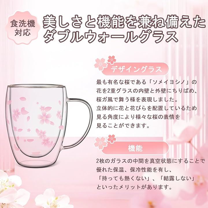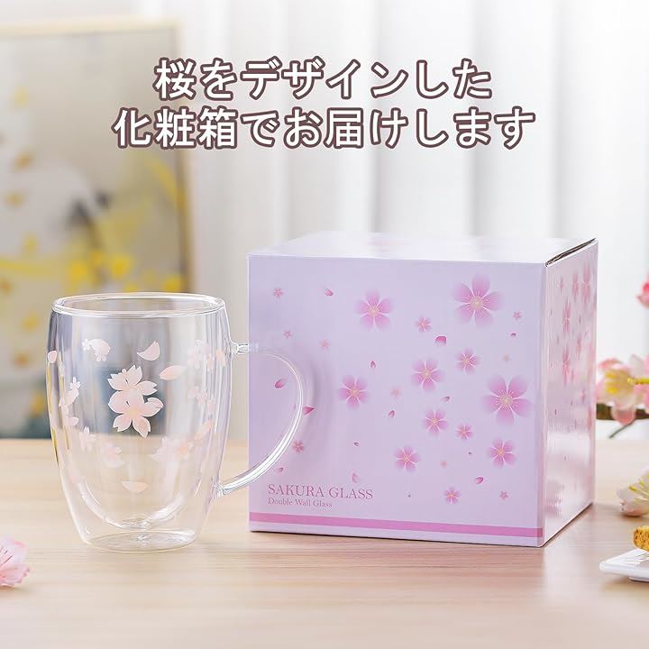 女性プレゼント ダブルウォールグラス さくら 350ml 誕生日 母の日 ギフト 卒業 退職 還暦祝い 取っ手付き 食洗機対応 桜柄 ギフト用マグカップ コーヒーカップ 化粧箱入り
