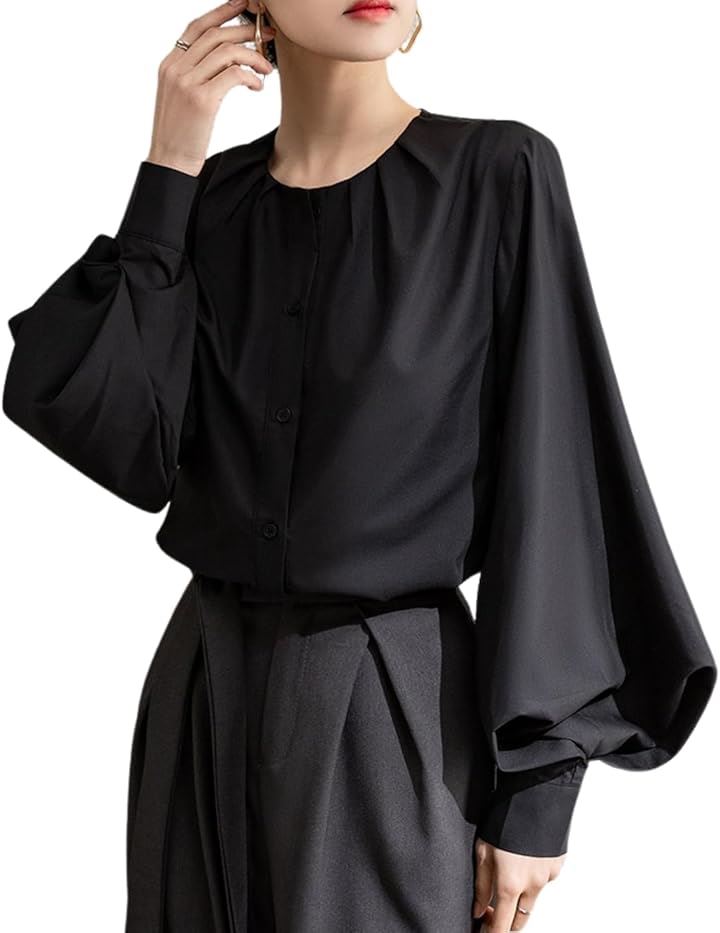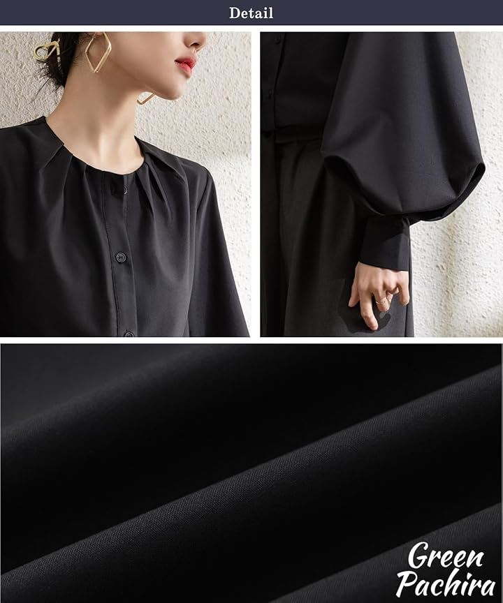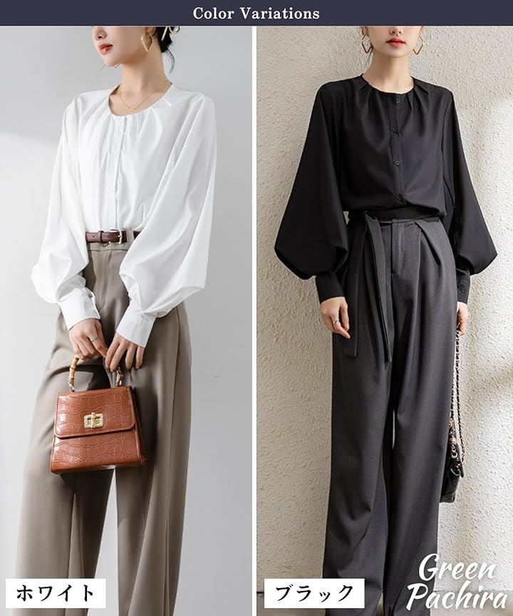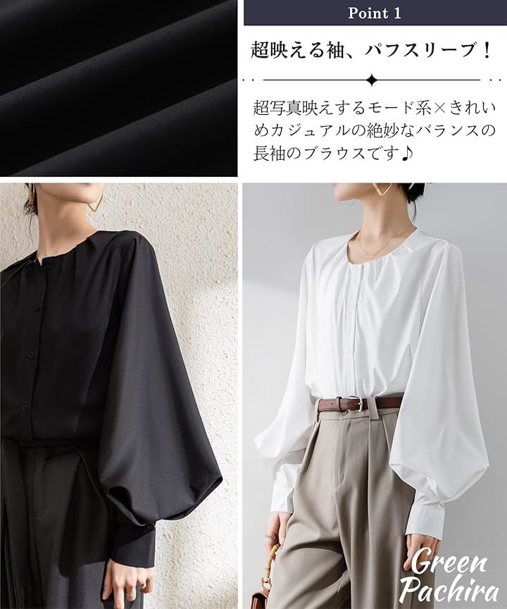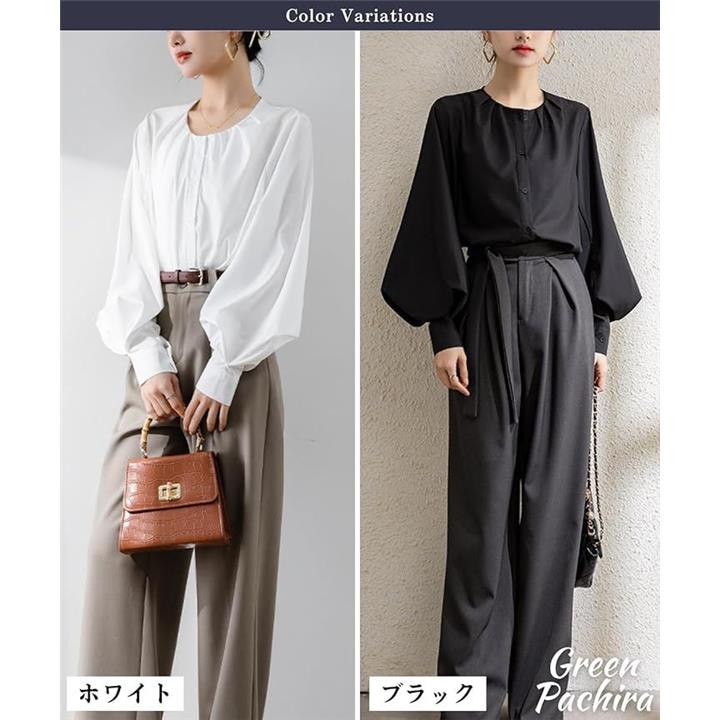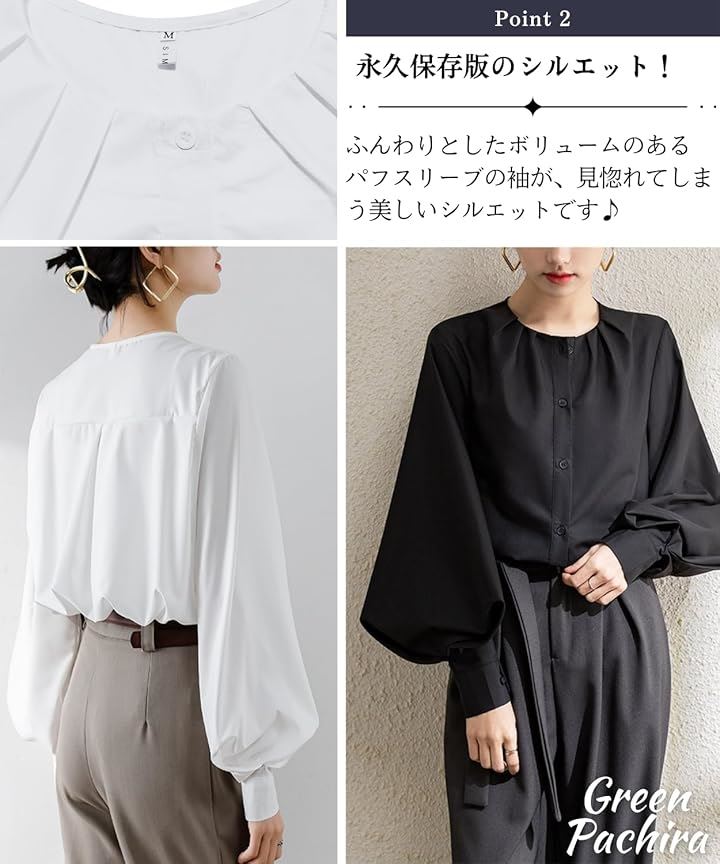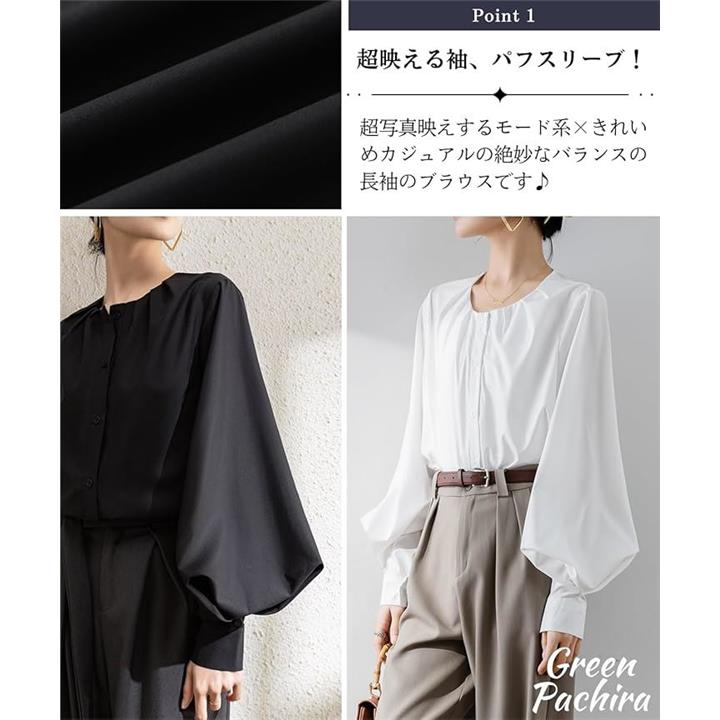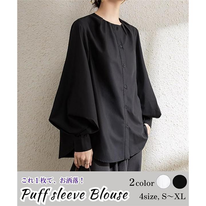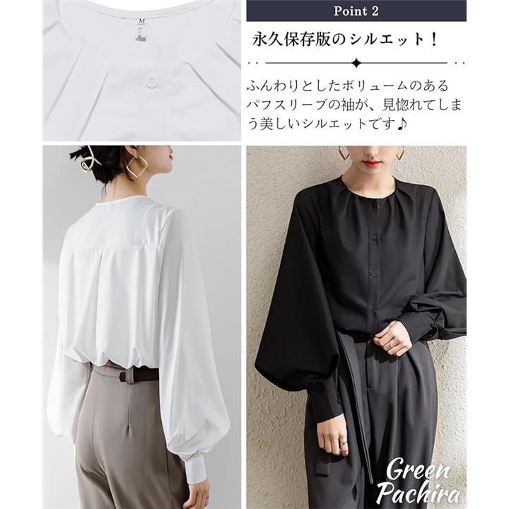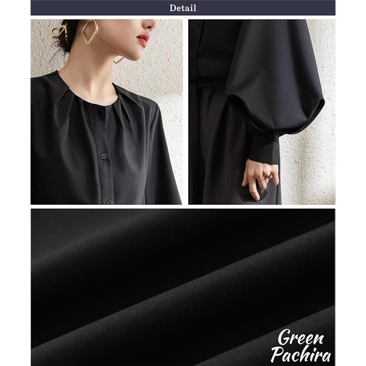 [グリーンパキラ] モード系 レディース ブラウス トップス シャツ パフスリーブ バルーン袖 長袖 丸首 きれいめ 女性 オフィスカジュアル 前開き ウーマン 襟なし 体型カバー 着痩せ おしゃれ オフィス |
