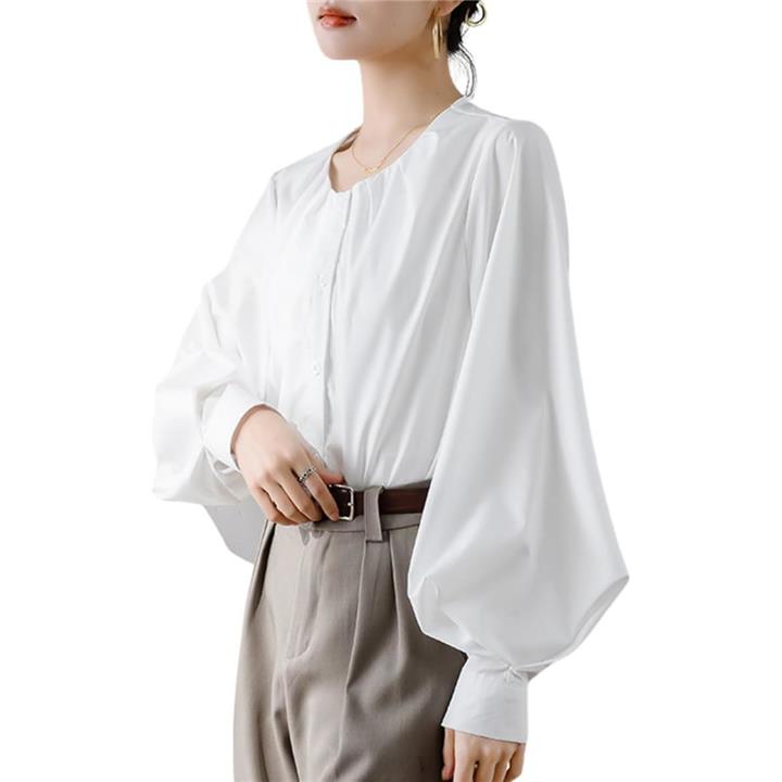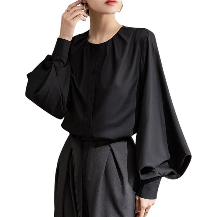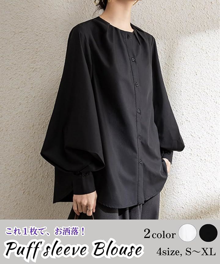 「超映える袖、パフスリーブ」超写真映えするモード系xきれいめカジュアルの絶妙なバランスの長袖のブラウスシャツ が完成。◉クルーネック(丸首)の襟なしデザインは、首元をすっきりとシャープに演出し、上品な印象に仕上げました。