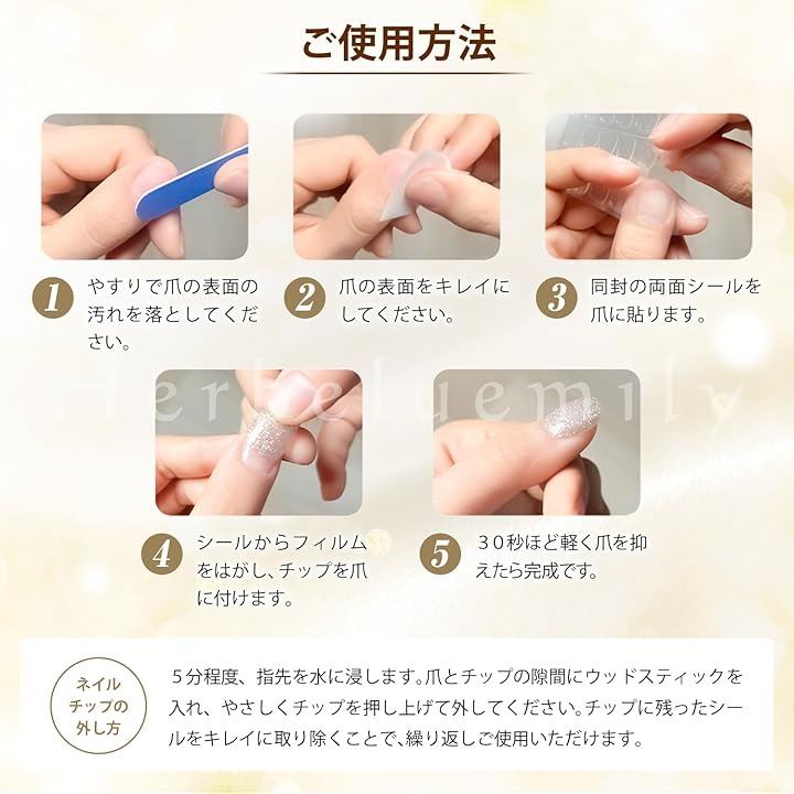 「ご使用方法」爪表面の汚れや油分を拭きとったのち、爪用両面シールを貼ります。
