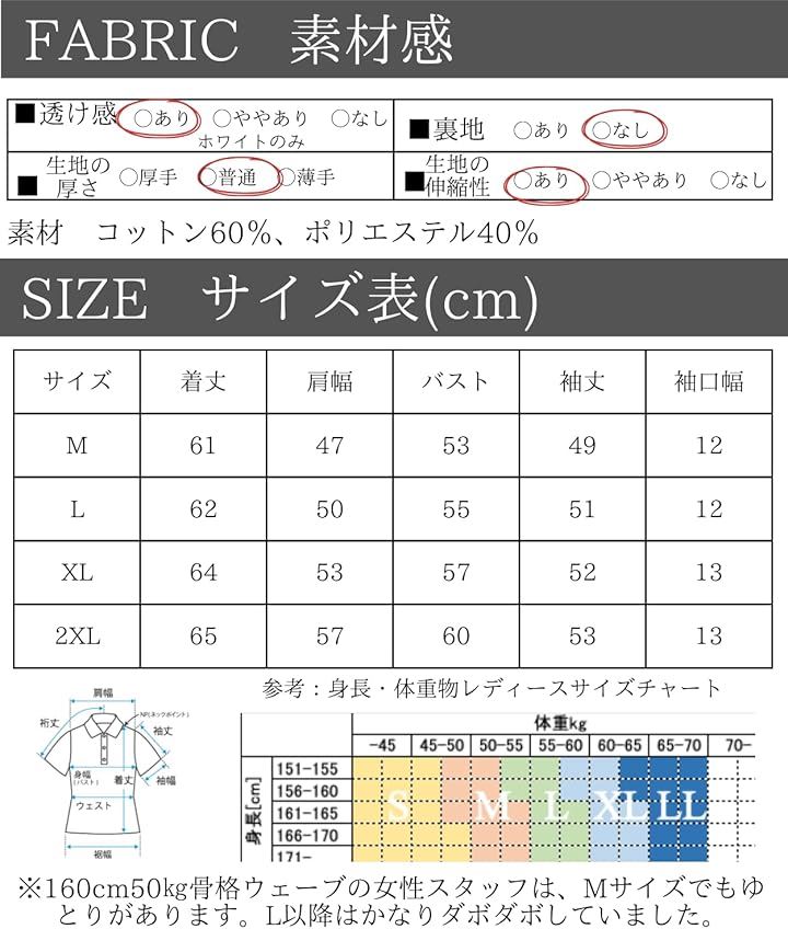 「素材」コットン60%、ポリエステル40% 「カラー」ブラック、ホワイト「サイズ(cm)」M 着丈61/肩幅47/バスト53/袖丈49/袖口幅12 L 着丈62/肩幅50/バスト55/袖丈51/袖口幅12 XL 着丈64/肩幅53/バスト57/袖丈52/袖口幅13 2XL 着丈65/肩幅57/バスト60/袖丈53/袖口幅13