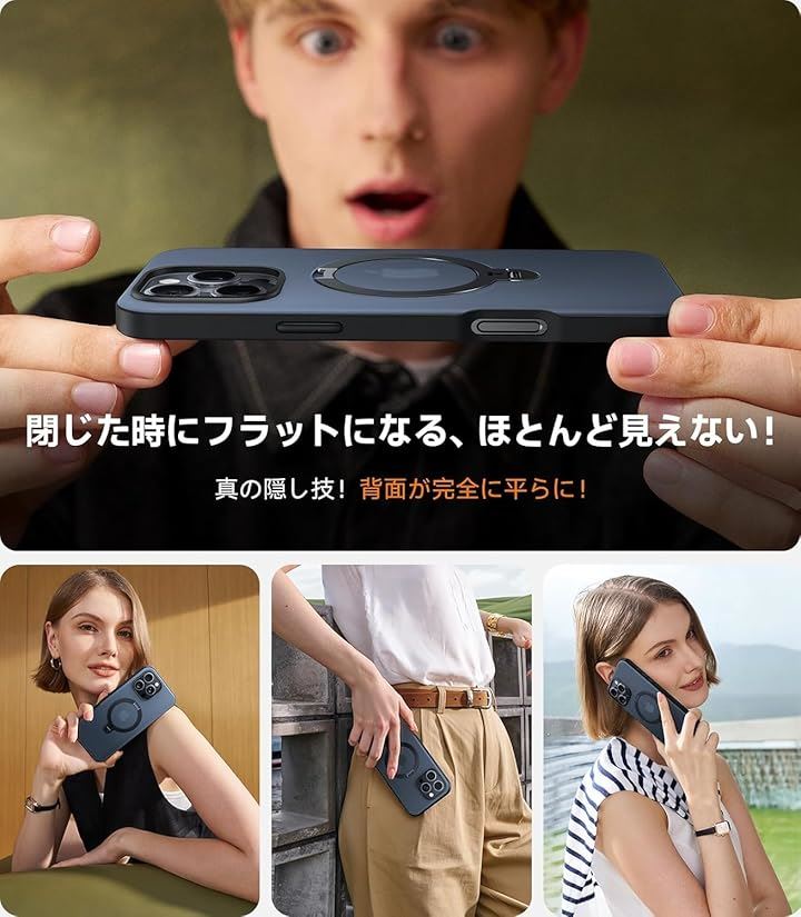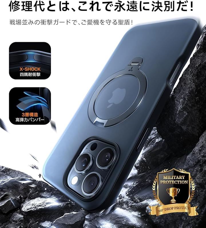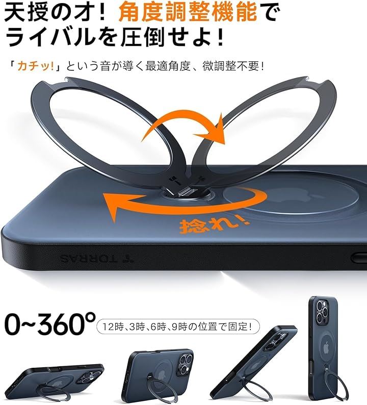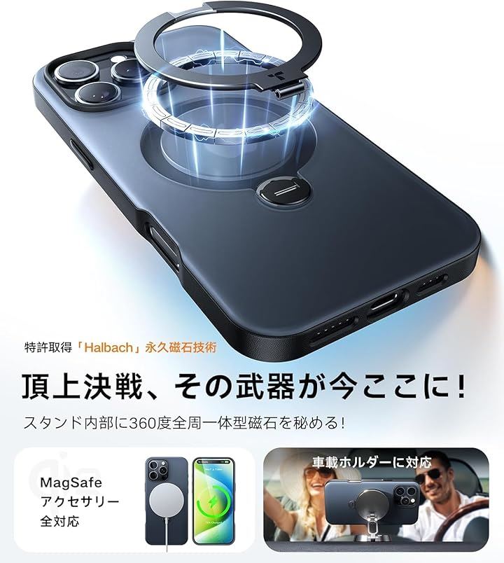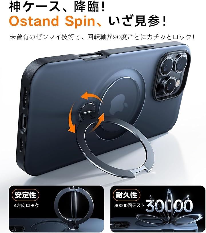 互換品 iPhone 16 pro ケース ゼンマイ式 スタンド 一体型 MagSafe 対応 耐衝撃 ワイアレス充電対応 6.3 インチ ブラック Ostand Spin マグセーフ対応 耐久性 ぴったり フィット 滑りにくい