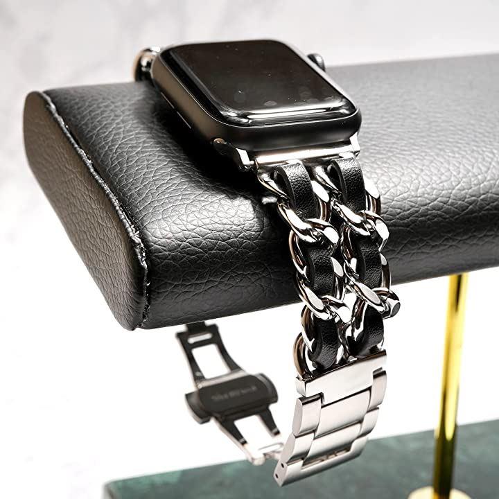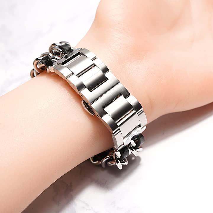 Royce&Roland Apple watch 編み込みバンド バタフライバックル おしゃれ アップルウォッチ 時計 バンド (ステンレス 本革/シルバー) メンズ レディース ギフト プレゼント (44mm 45mm 46mm 49mm, シルバー/ブラック) |