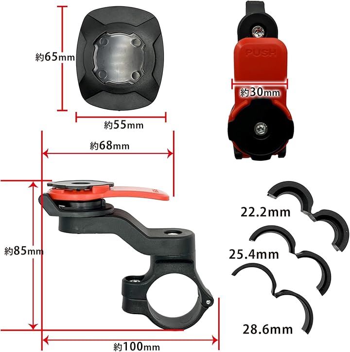 「幅広いハンドルバーサイズに対応」このバイクスマホホルダー、自転車スマホホルダーは、バイクや自転車のハンドルバーやステムのような直径約22.2~31.8mmのバーサイズに対応しています。