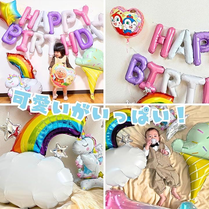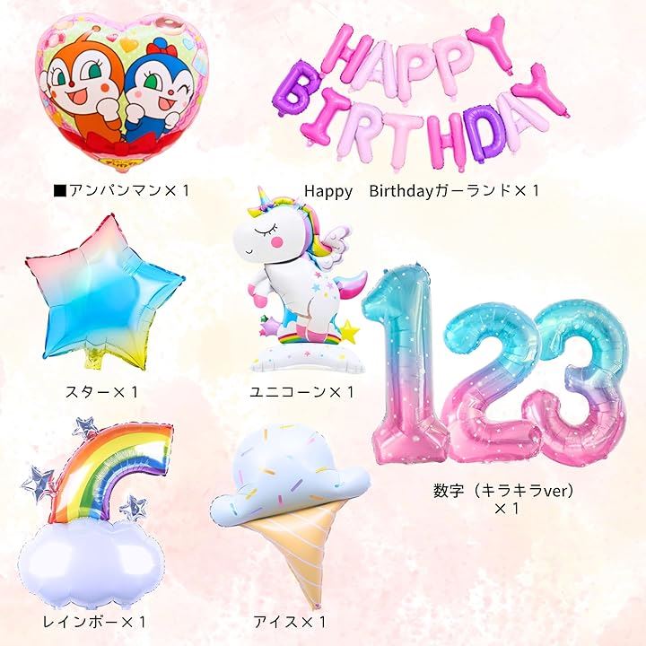 セット内容: HappyBirthdayガーランド、ドキンちゃん&コキンちゃんバルーン、ユニコーンバルーン、レインボーバルーン、数字1バルーン、星型バルーンを含む豪華セット