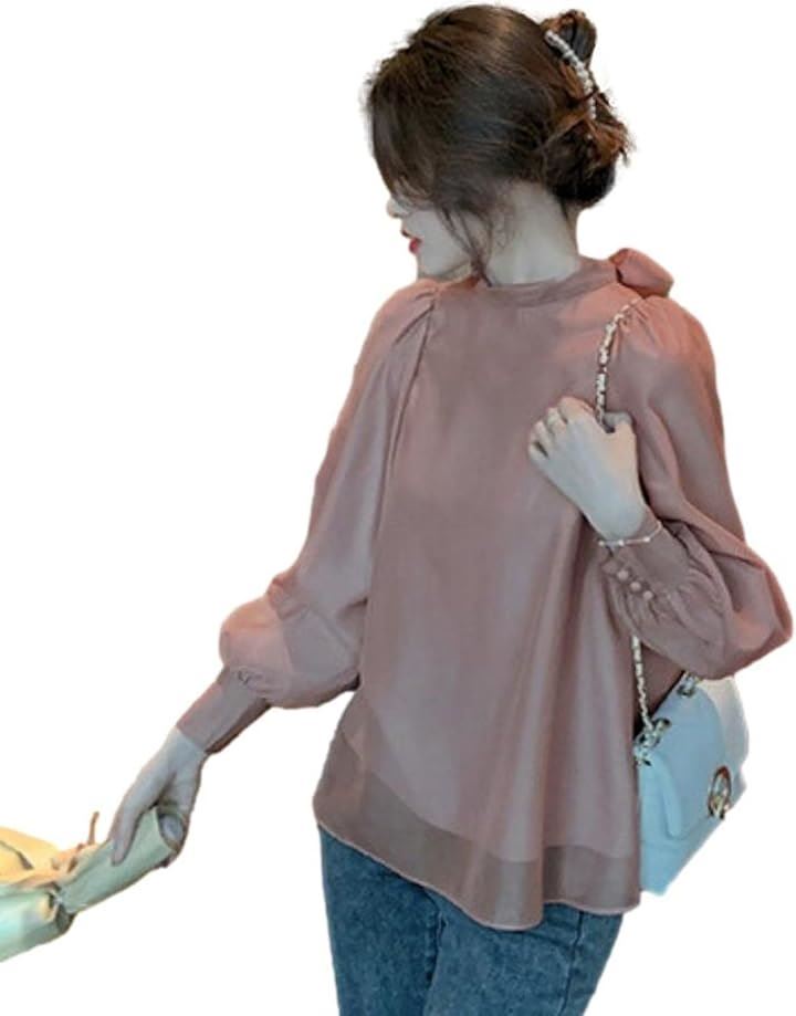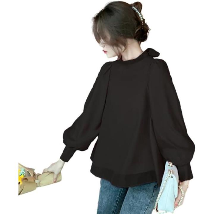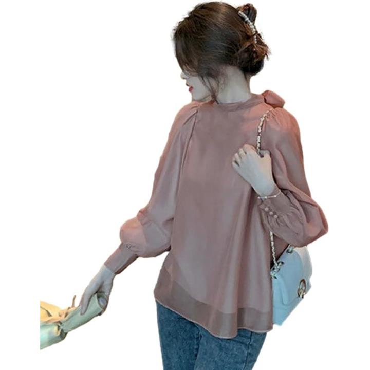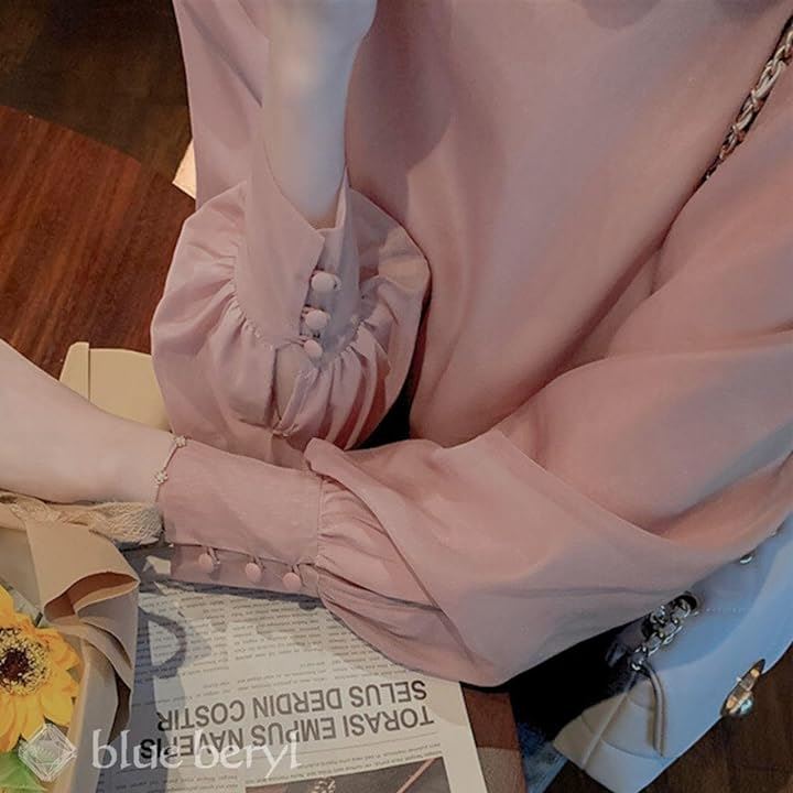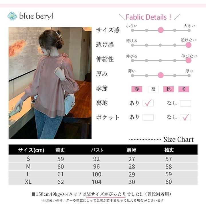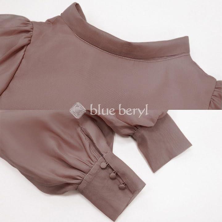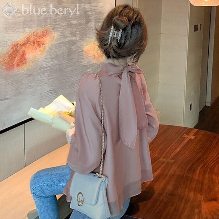 [blue beryl] [ブルーベリル] ブラウス レディース バックリボン シフォン フレア パフスリーブ 長袖 立ち襟 くるみ釦 カフス BB025 |