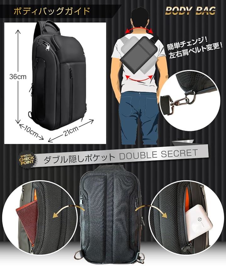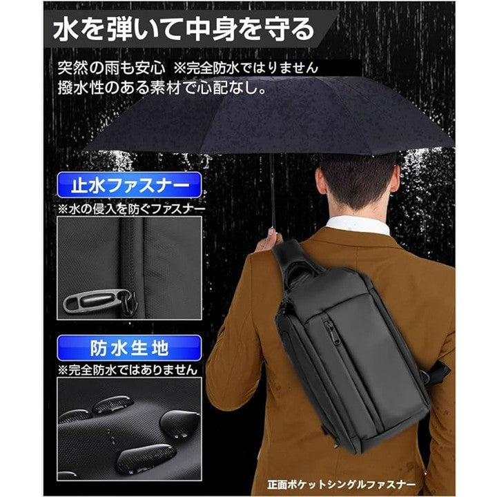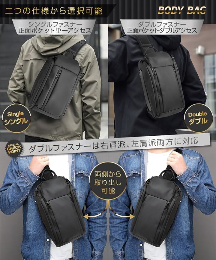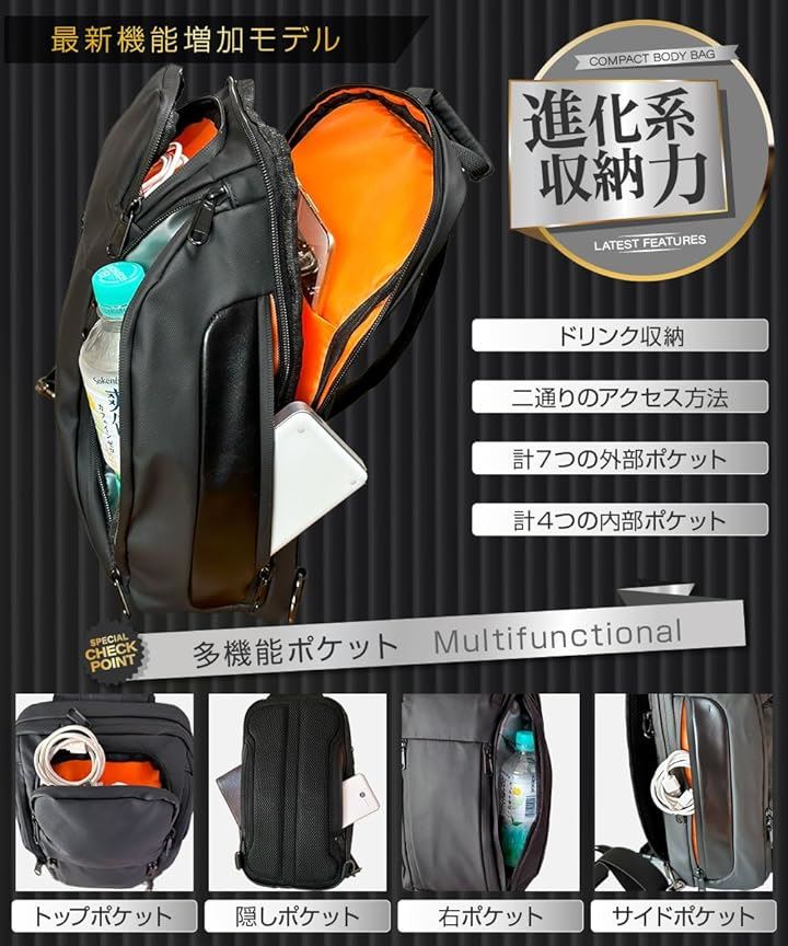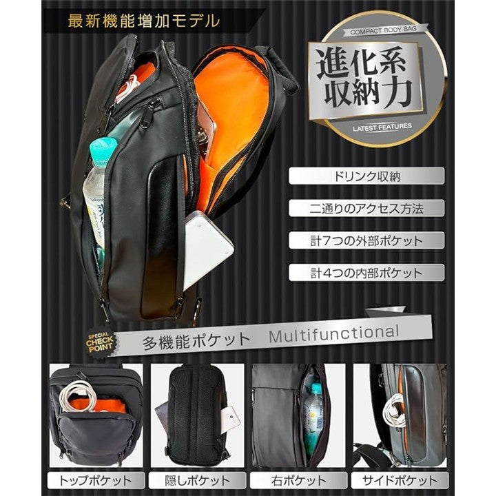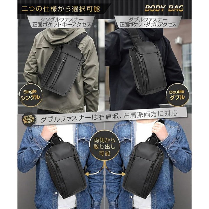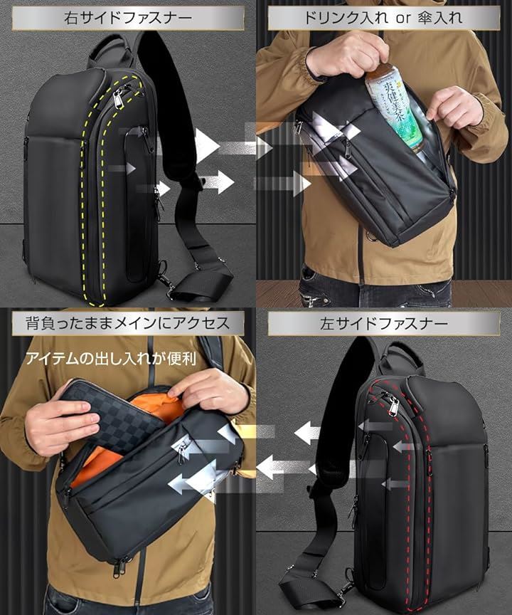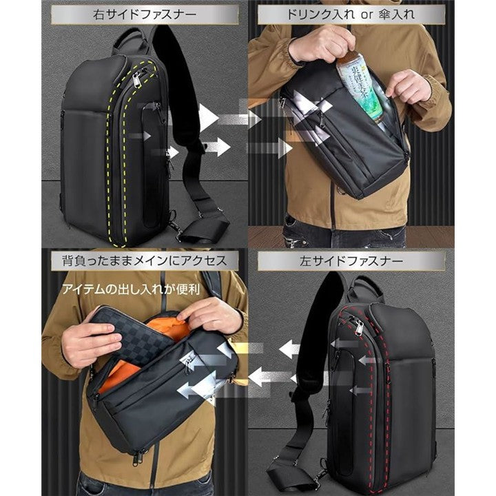 ボディバッグ ドリンクホルダー付き ショルダーバッグ 斜め掛け 大容量 メンズ 止水ファスナー ブラック 多機能 機能増加モデル
