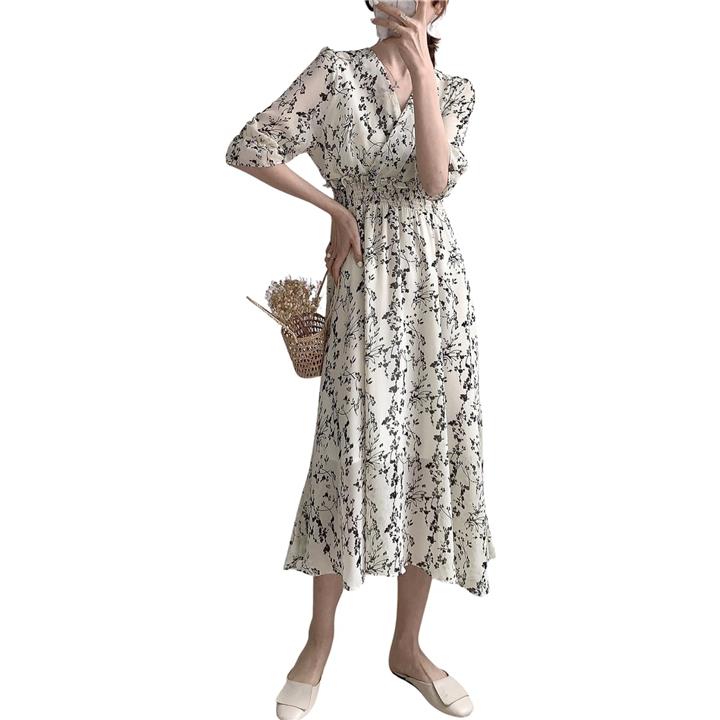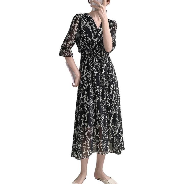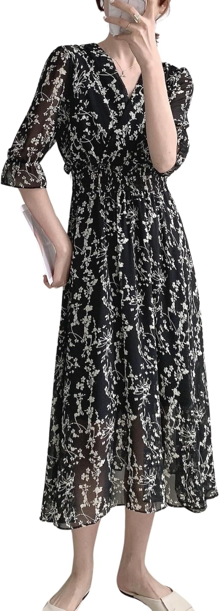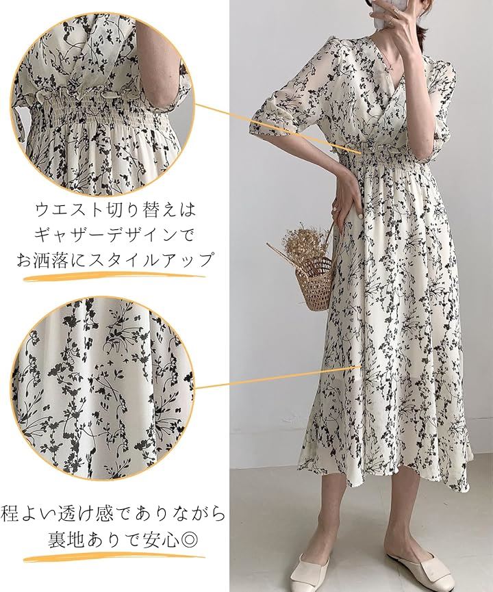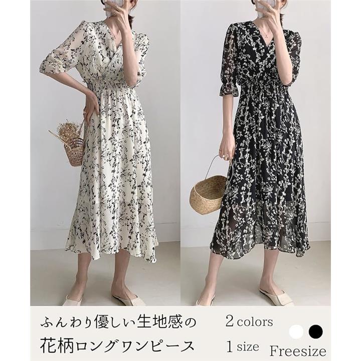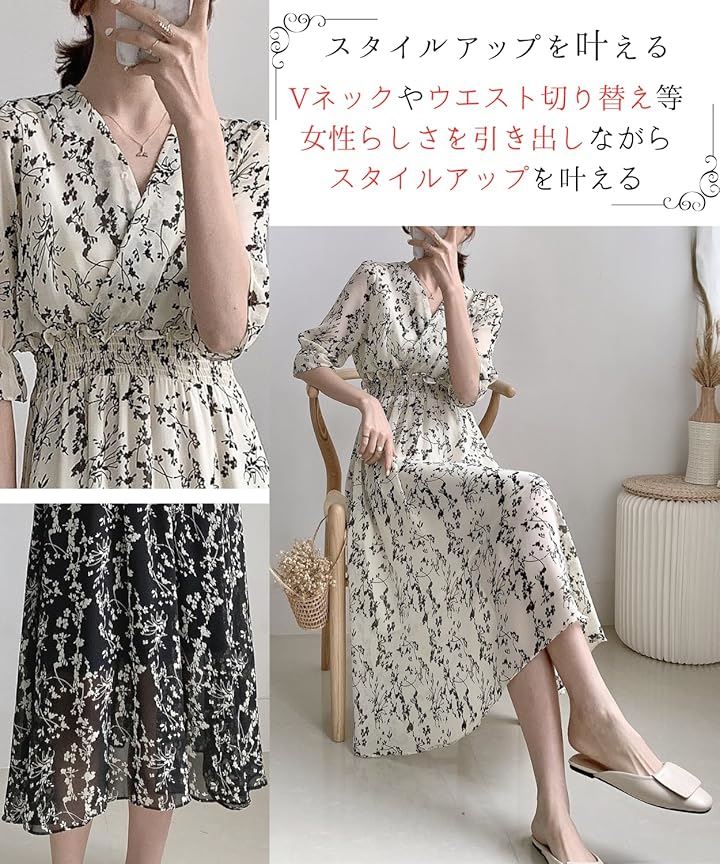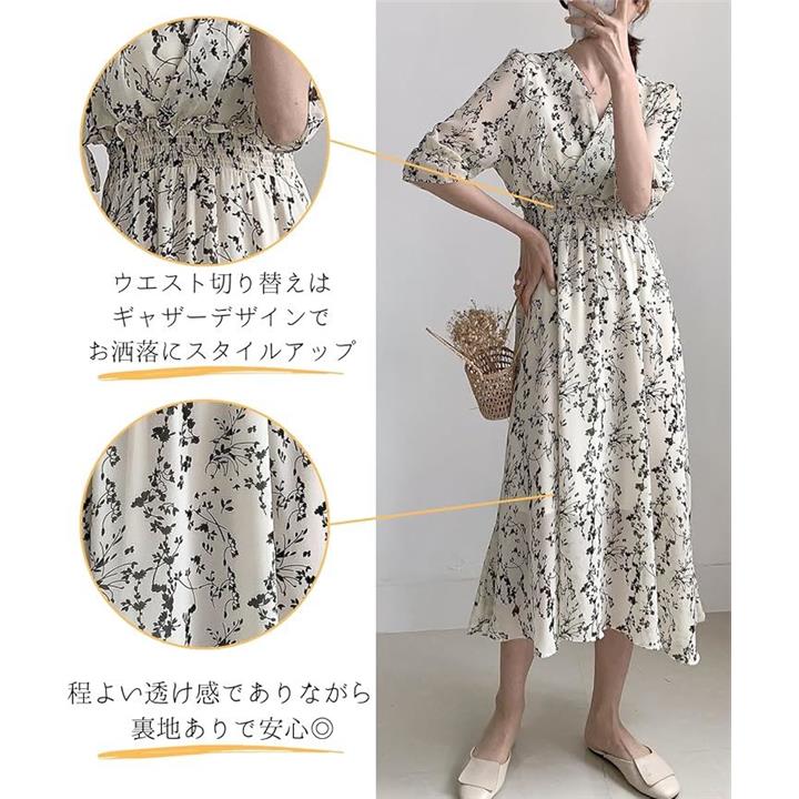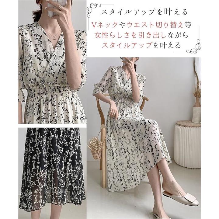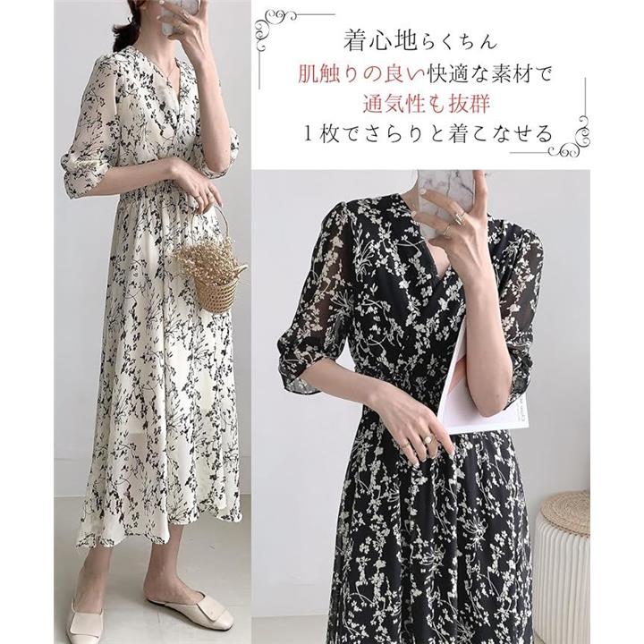 大人可愛い シフォンワンピース レディース 長袖 aライン カジュアル サマードレス リゾート ゆったり きれいめ ロング 半袖 5分袖 花柄