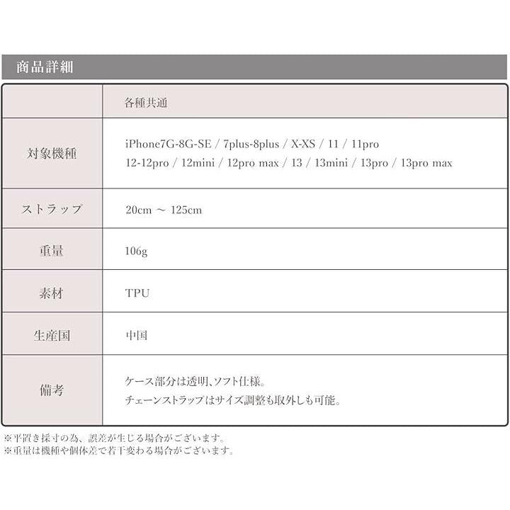 「特徴」チェーンストラップ/ケース部分透明・ソフト仕様/ストラップサイズ調整可・取外し可 *製品の仕様上鋭利な部分がございます、パーツの取り外し等の際は手を挟まないよう十分ご注意ください。