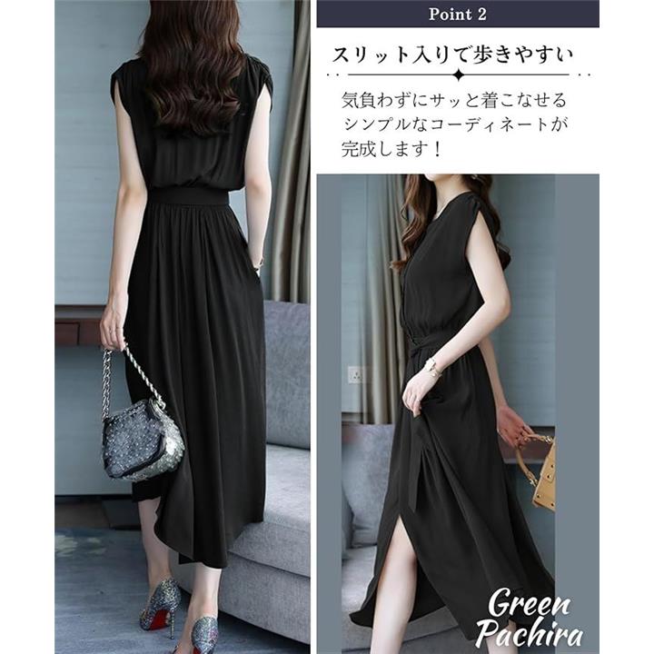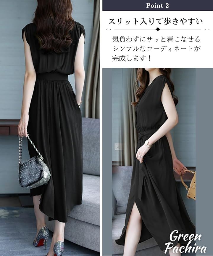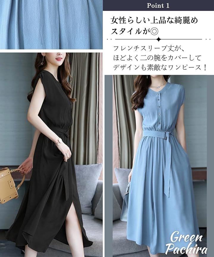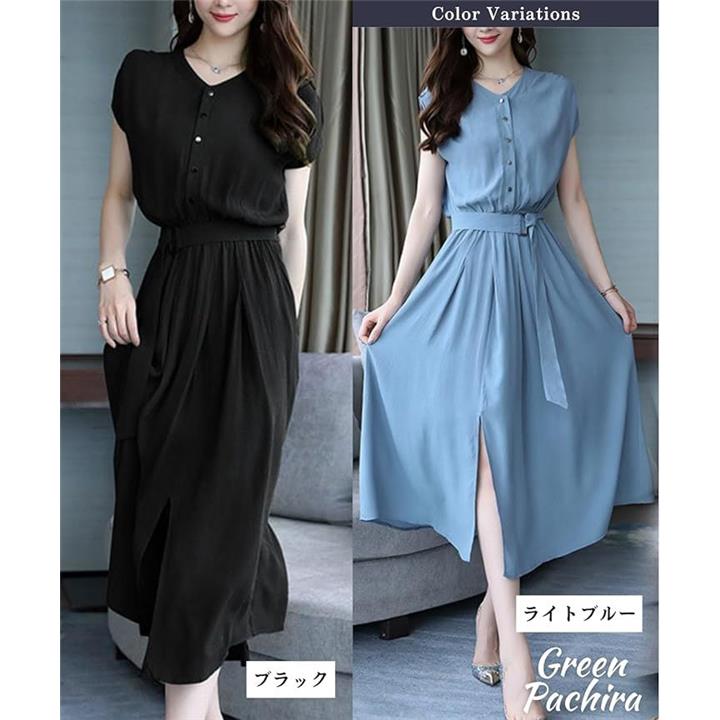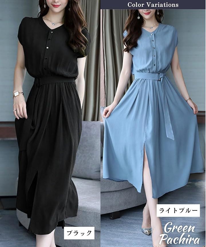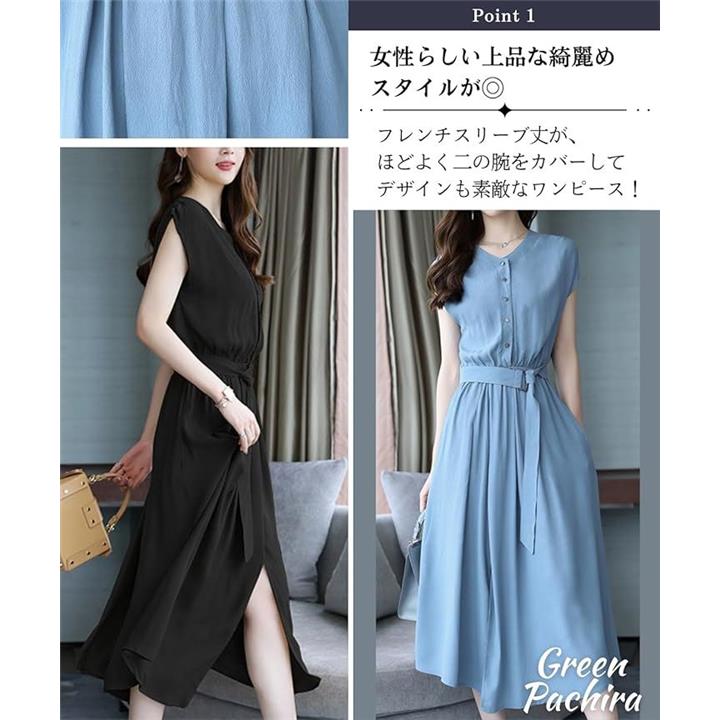 [グリーンパキラ] スリットワンピース ロング Aライン レディース 可愛い 春夏秋 きれいめ とろみ Vネック フレンチ袖 膝下 ロングワンピース |