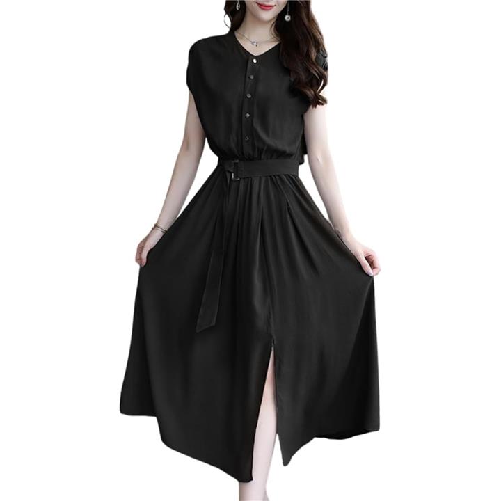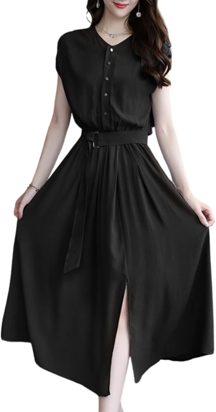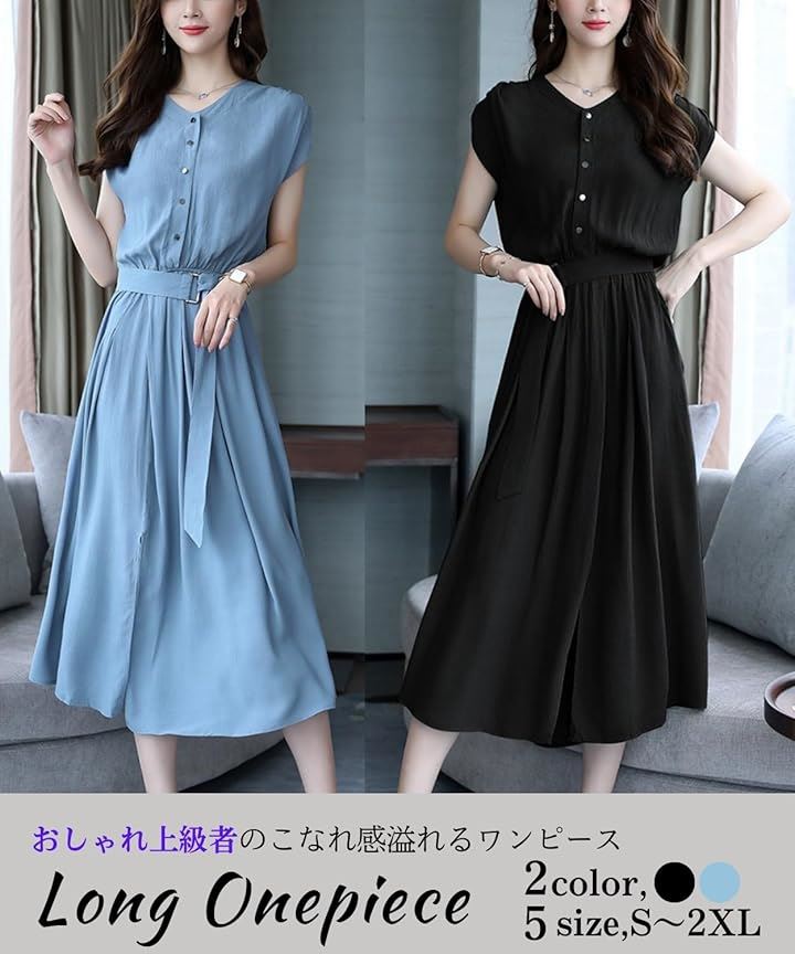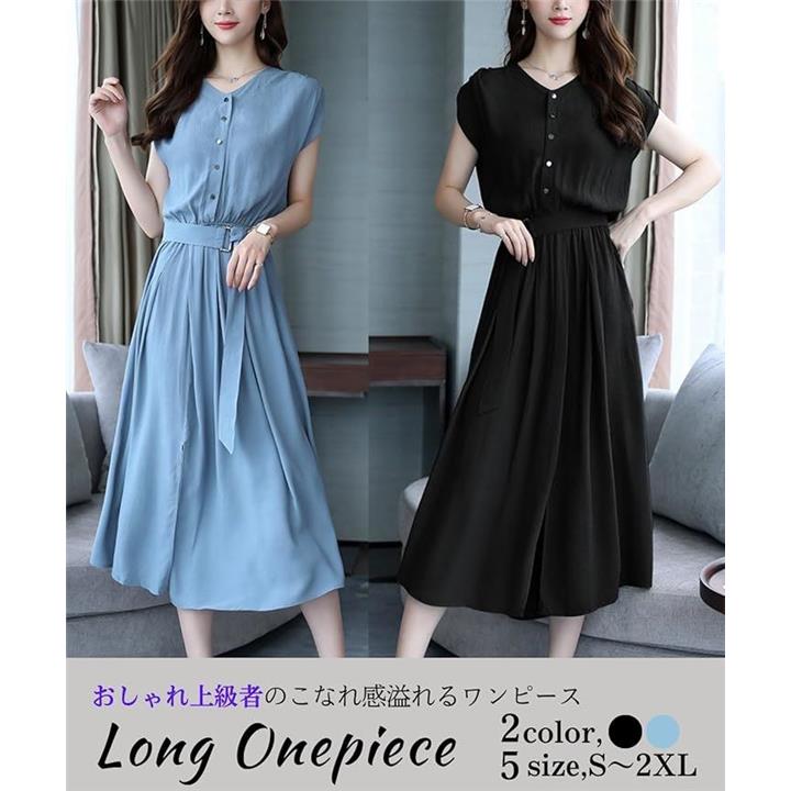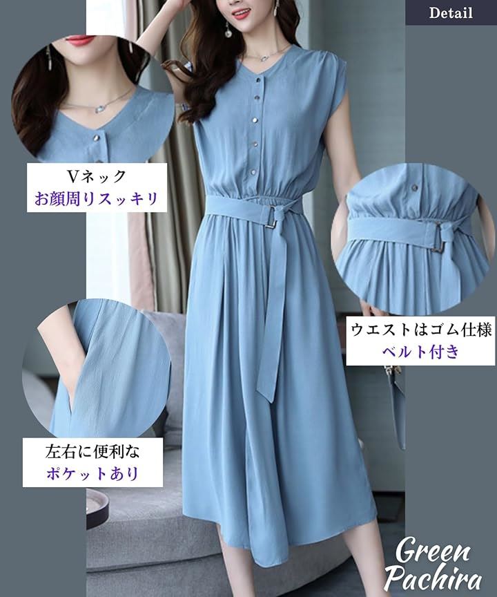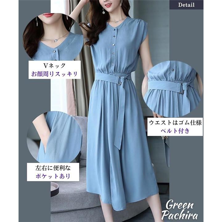 [グリーンパキラ] スリットワンピース ロング Aライン レディース 可愛い 春夏秋 きれいめ とろみ Vネック フレンチ袖 膝下 ロングワンピース |