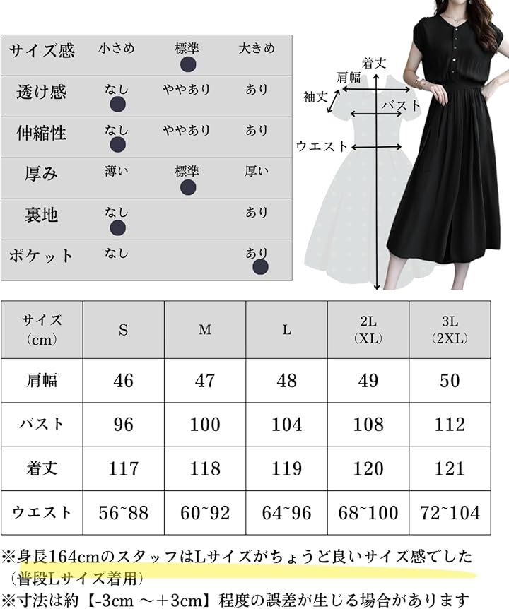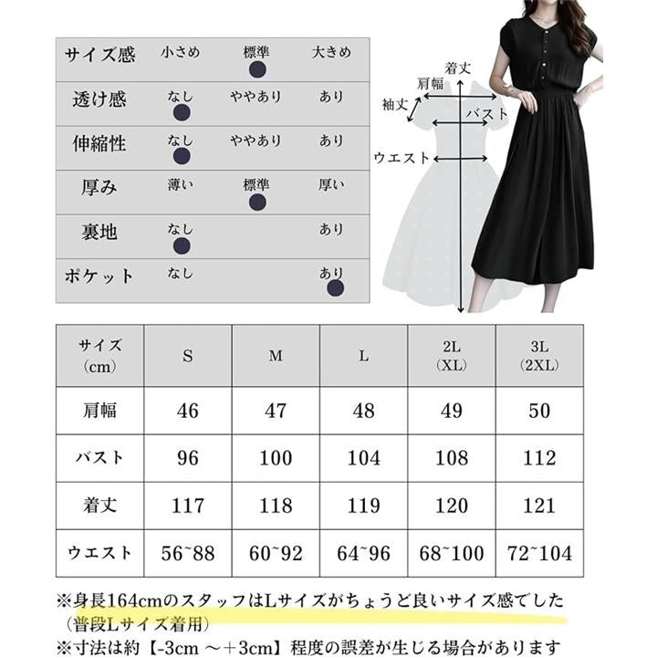 3Lサイズ:肩幅 約50cm/バスト 約112cm/着丈 約121cm/ウエスト 約72~104cm 。