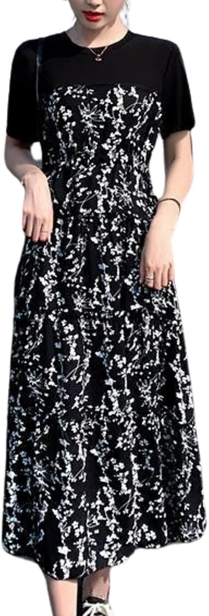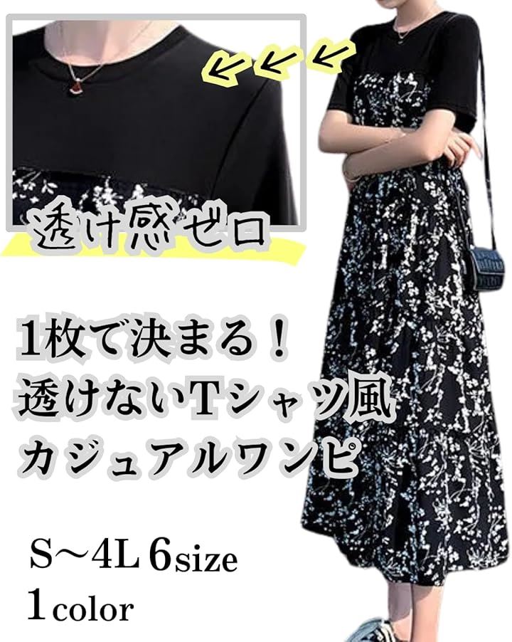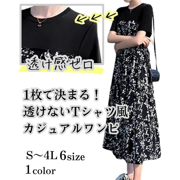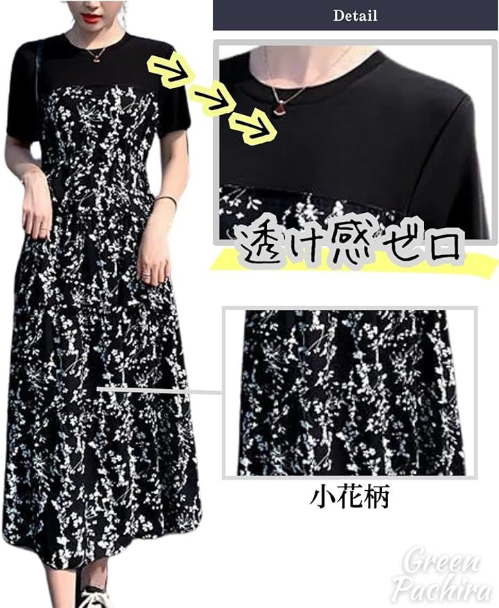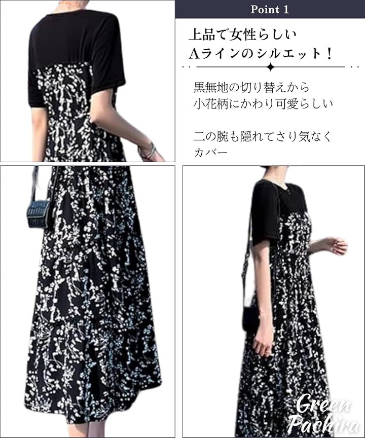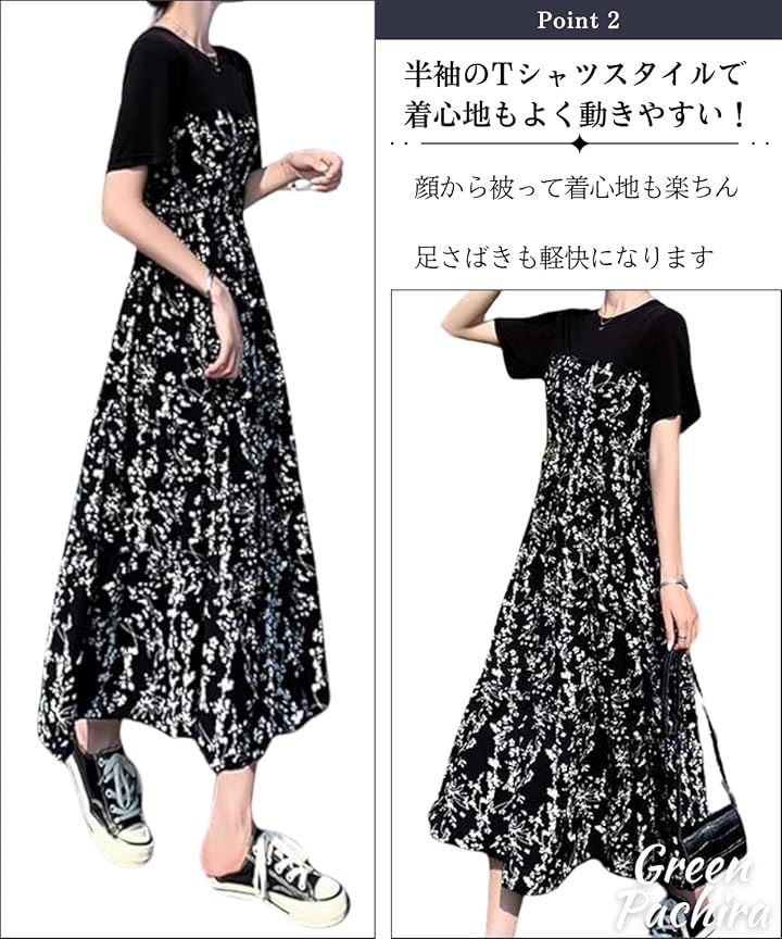 [グリーンパキラ] 半袖 ワンピース レディース カジュアル 花柄ワンピース aラインワンピース tシャツ 切り替え 黒 小花 膝下 大きいサイズ フレア 低身長 丸首 可愛い |