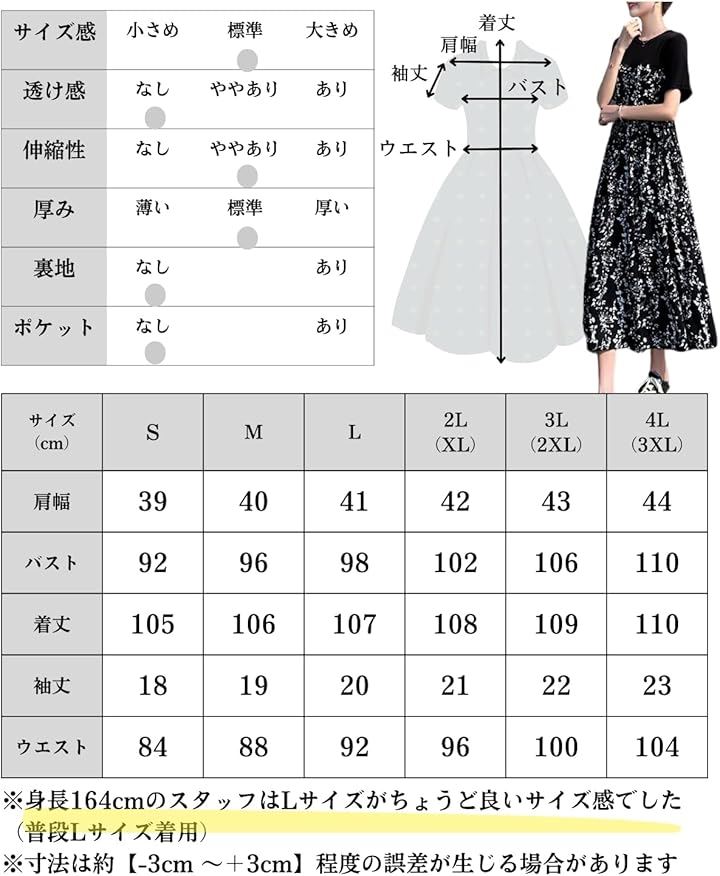 3Lサイズ:肩幅 約43cm/バスト 約106cm/着丈 約109cm/袖丈 約22cm/ウエスト 約100cm 。