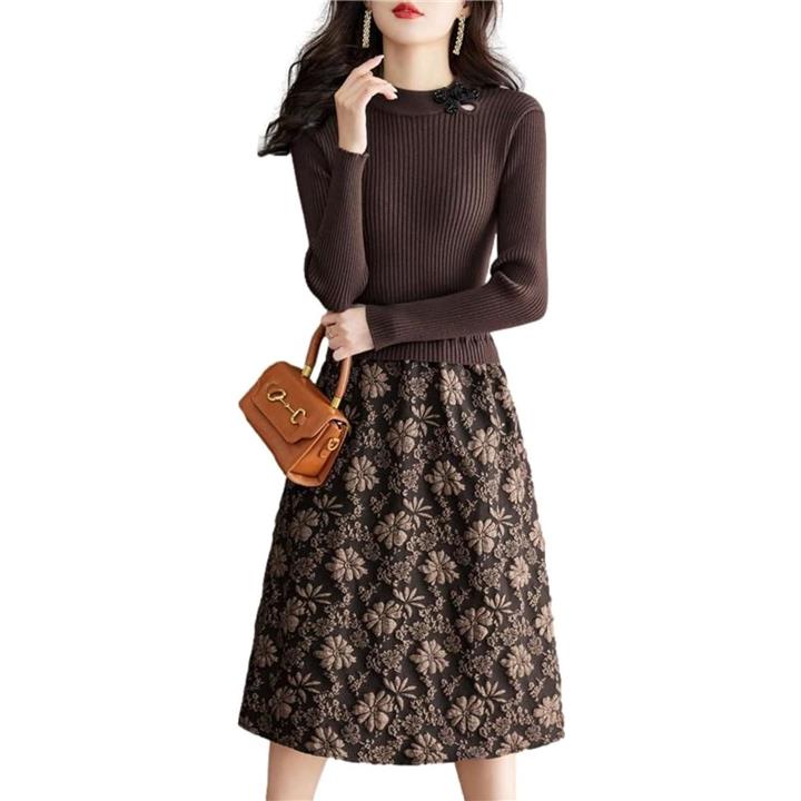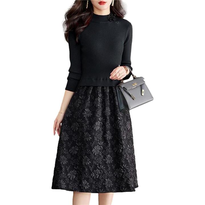 ドッキングワンピース レディース リブニット 花柄 長袖 チャイナボタン BB023 |