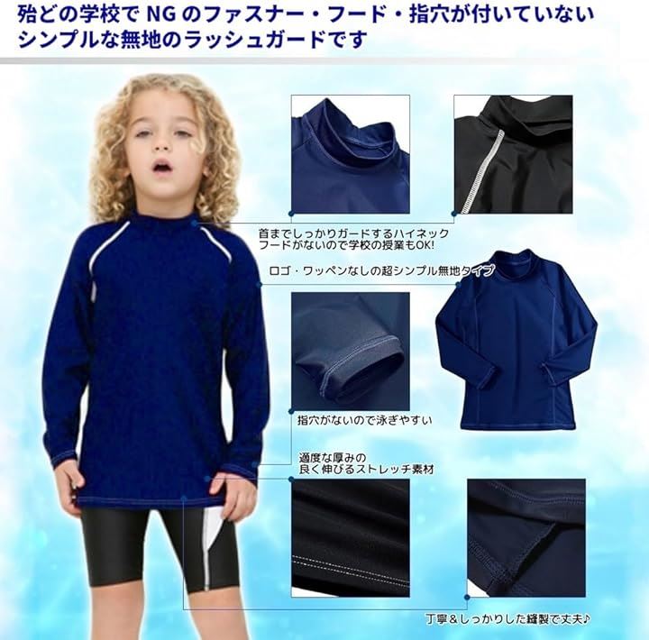 [RSSR] ラッシュガード 「学校用・ハイネック・フードなし・ファスナーなし・指穴なし・無地」 長袖 キッズ ジュニア 子供 スクールラッシュガード スクール水着 UVカット (130, ステッチ紺) |