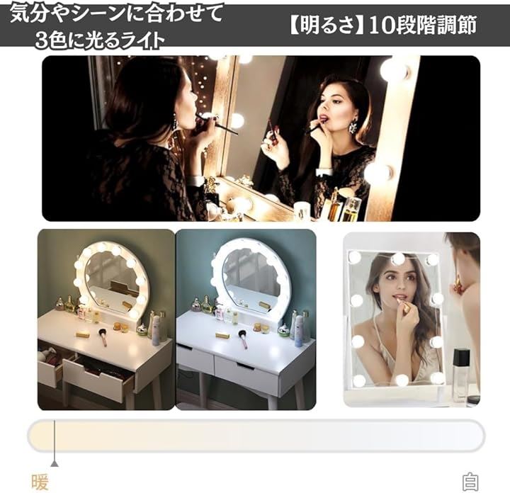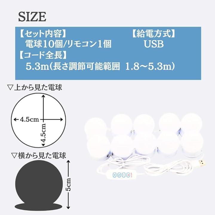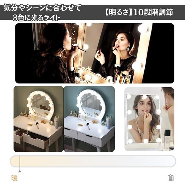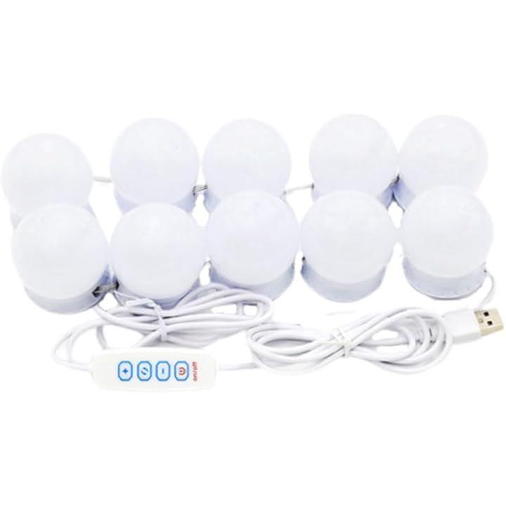 女優ライト 後付け ドレッサー LED ミラーライト USB給電 3色電球 明るさ10段階 電球10個セット