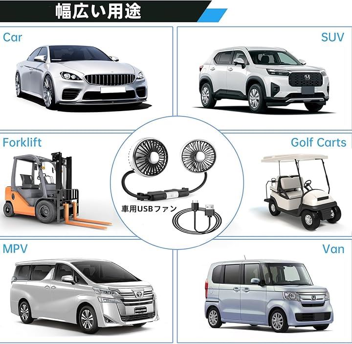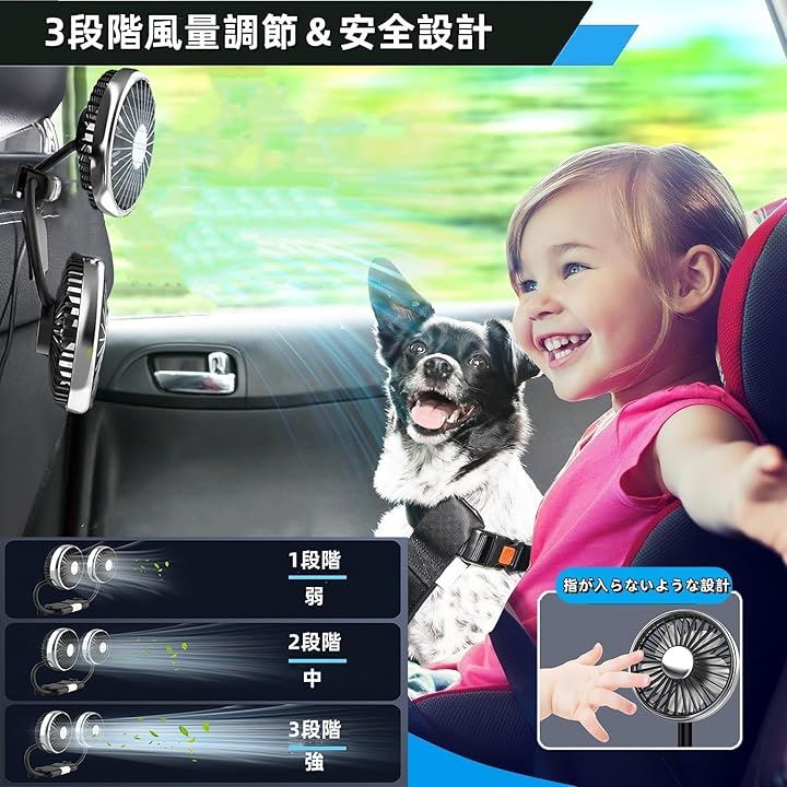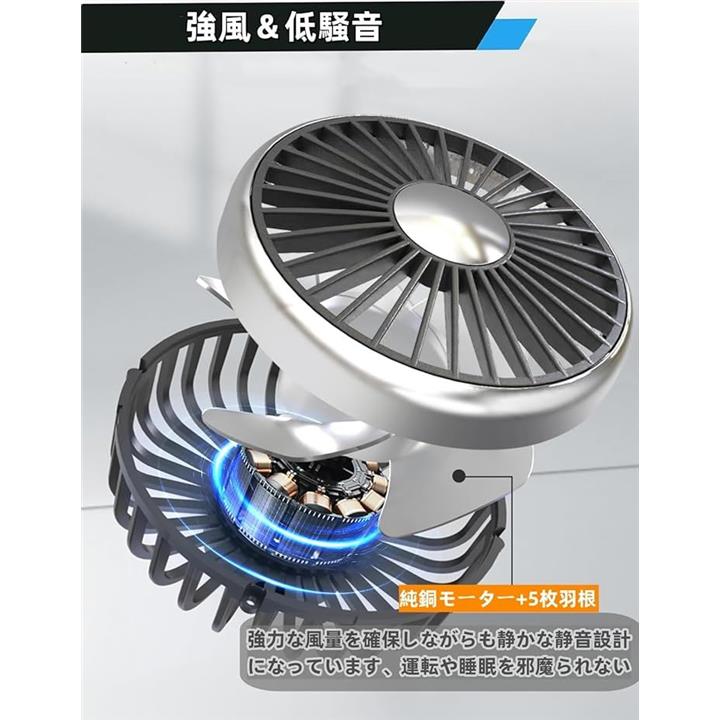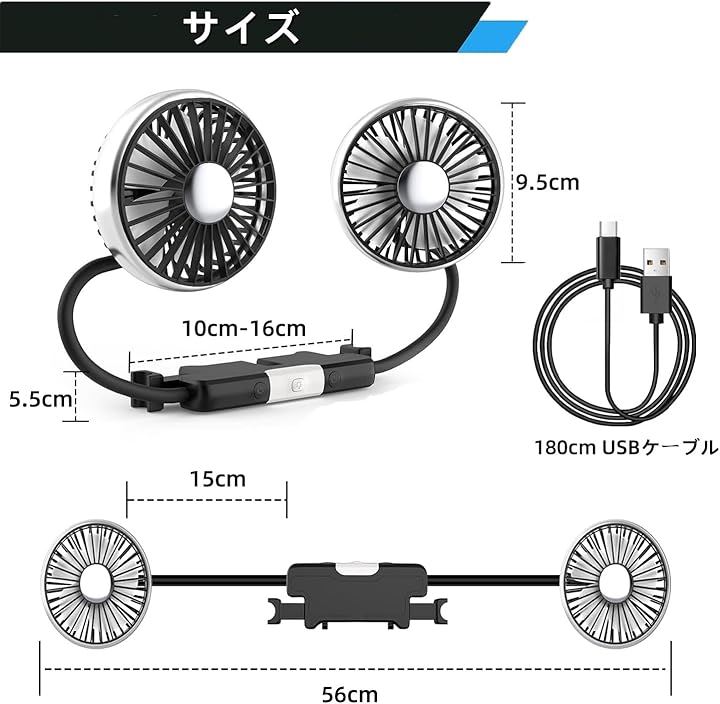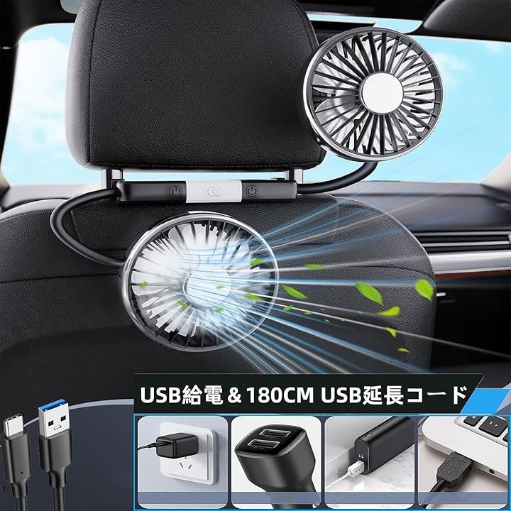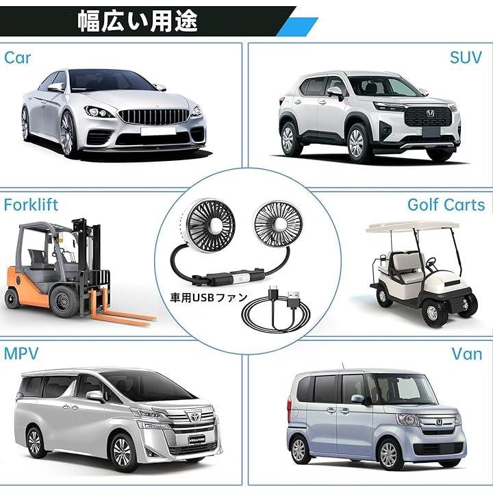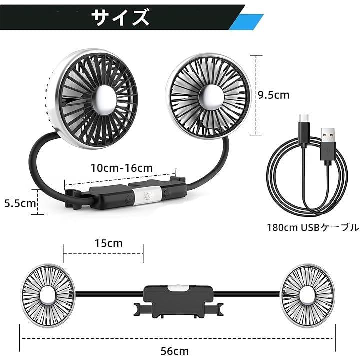 個別スイッチ仕様車 扇風機 車用扇風機 USB 双頭車載ファン 後部座席の使用 LEDライト付き 3階段風量調節 低騒音 5枚羽根 車用ファン 360°角度調節可能 約180CM USB延長コード 空気循環 蒸れ解消 取付簡単 夏対策 車中泊対策 カー用品