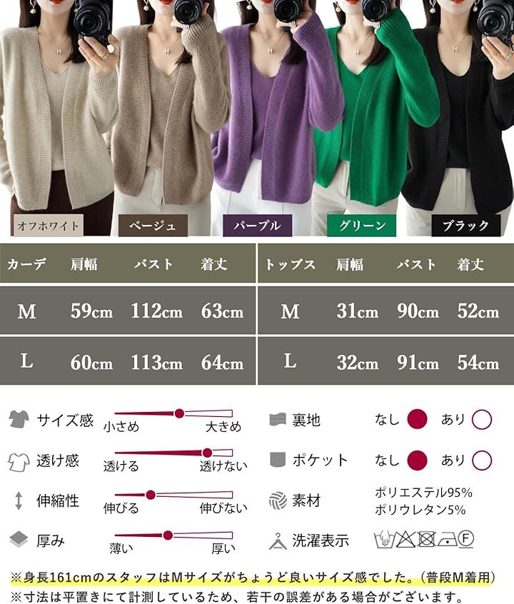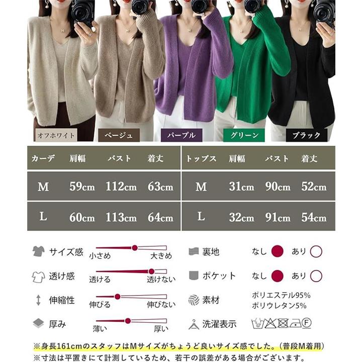 カーディガン:肩幅/バスト/袖丈/着丈 「M」59/112/47/63 「L 」60/113/48/64 トップス:肩幅/バスト/着丈 「M」31/90/52 「L 」32/91/54