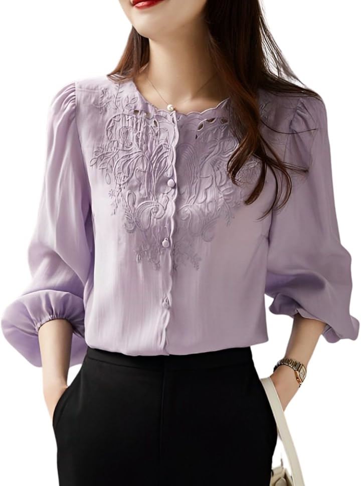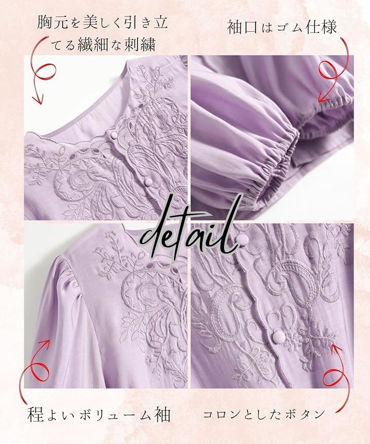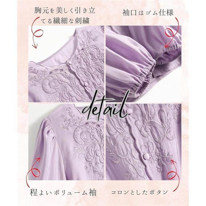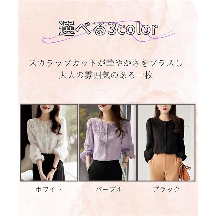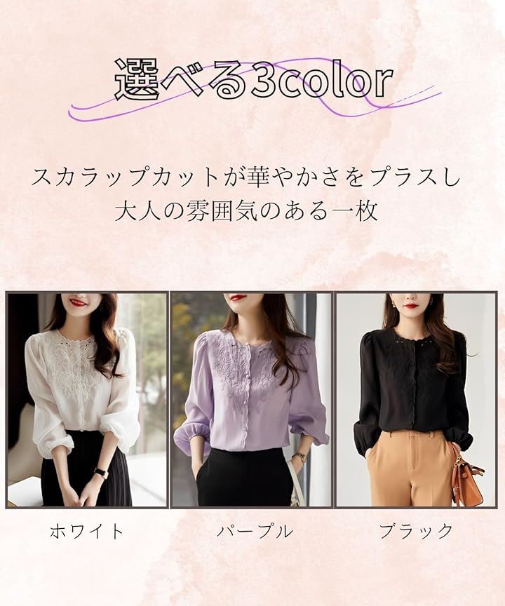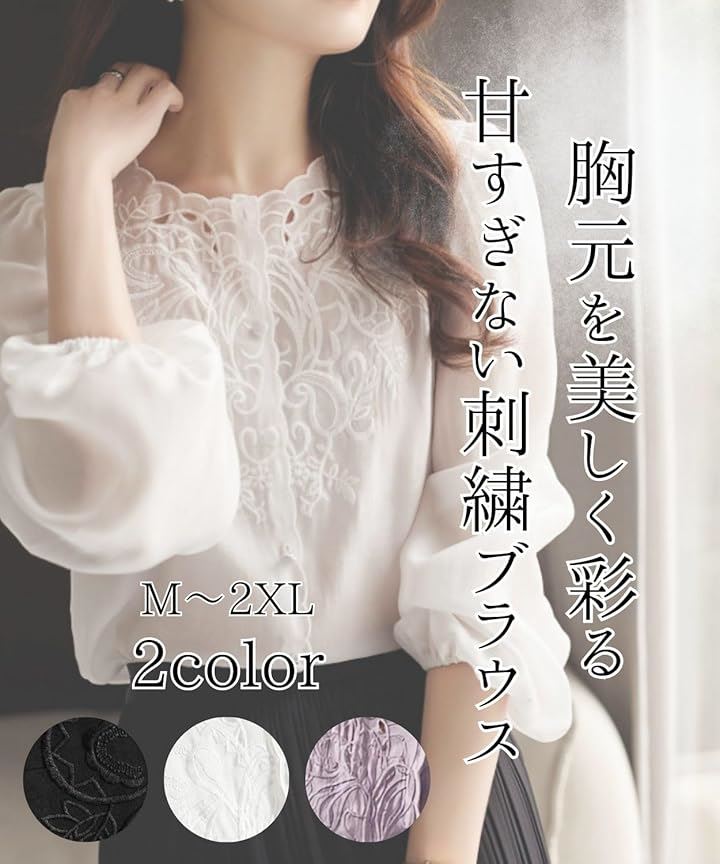 このブラウスは、黒、白、紫の3色展開で、胸元には美しい花柄の刺繍が施され、シンプルながら華やかな印象を与えます。