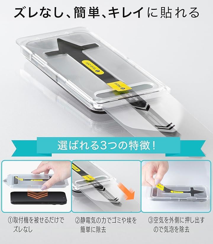 「ズレなし、簡単、キレイに貼れる」独自のズレや気泡のない、精密な貼り合わせを実現する貼り合わせ機がiPhone16Plusと固定してくれるので老眼・シニアの方でもズレなしでガラフフィルムをキレイに貼れます。