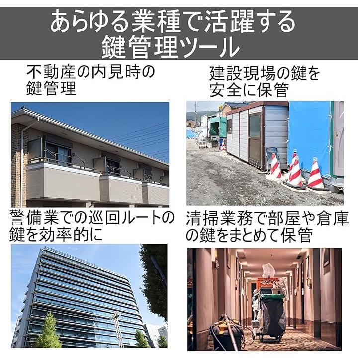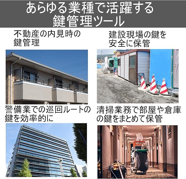 「あらゆる業種で活躍する鍵管理ツール」不動産業での物件内見時の鍵管理や建設業での現場の鍵保管はもちろん、清掃業での部屋や倉庫の鍵の一括管理、ビル管理業での巡回ルートの鍵管理など、多岐にわたる業種で使用されています。