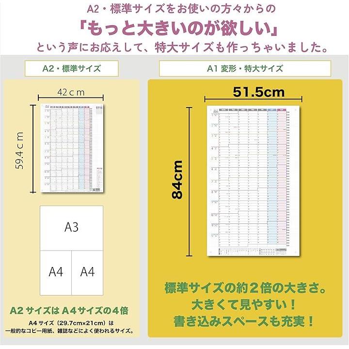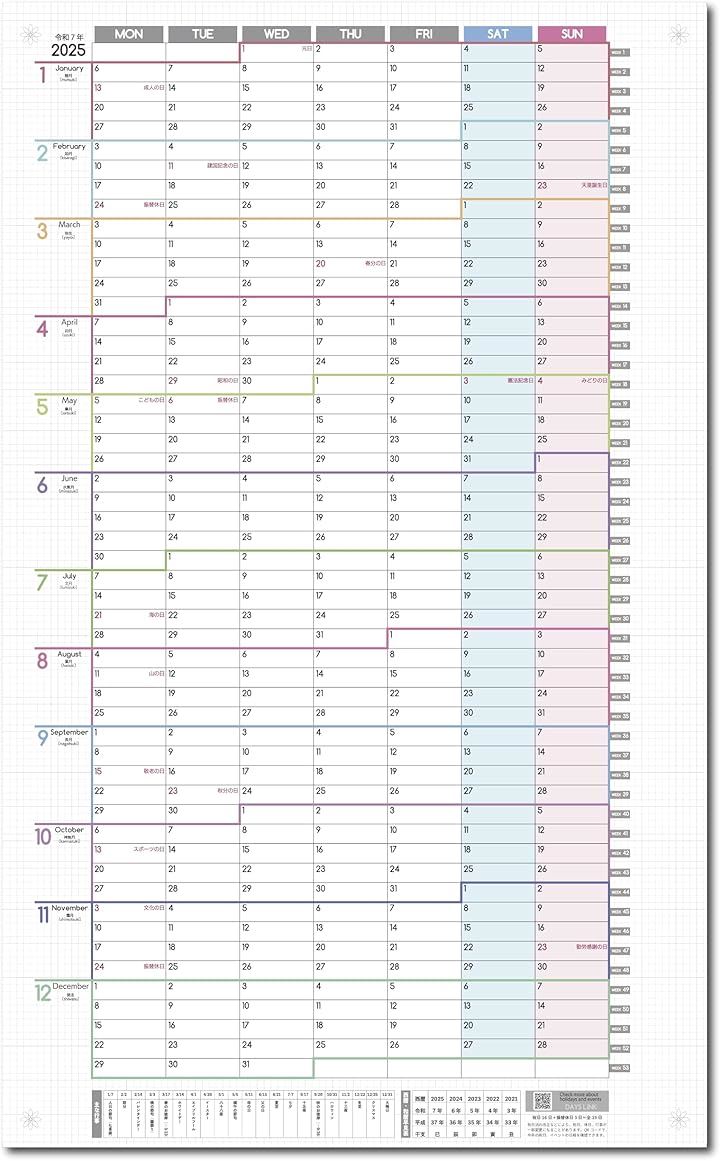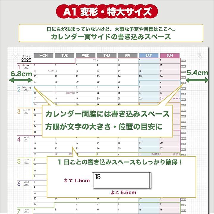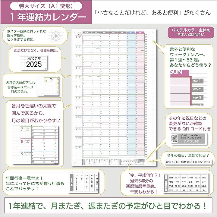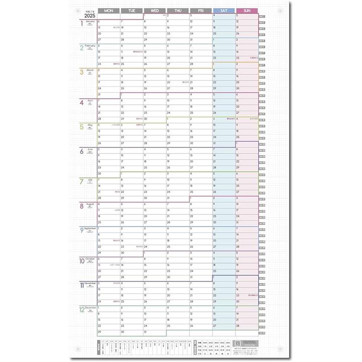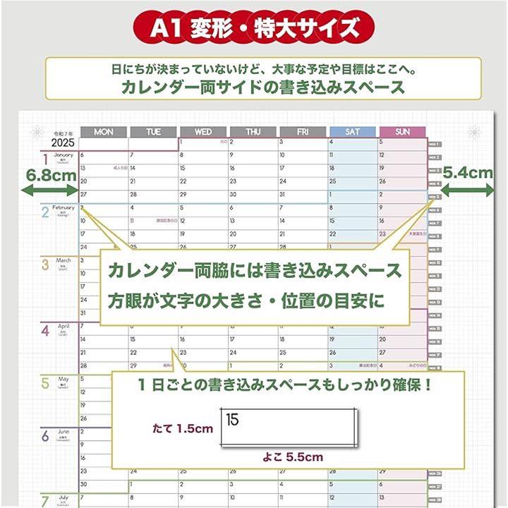 特大サイズ 1年連結カレンダー ポスター GRID 2025年 1月始まり 月曜始まり 大きい 壁掛け 令和7年 A1変形サイズ