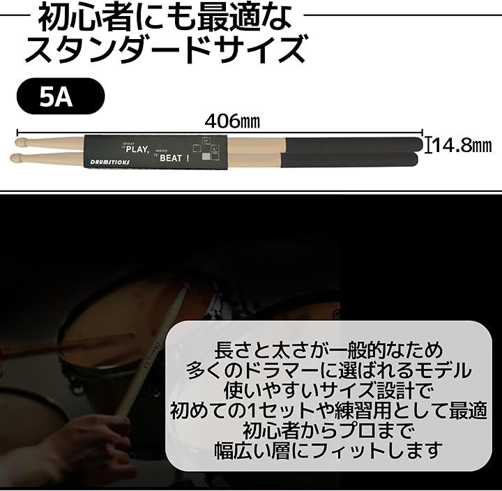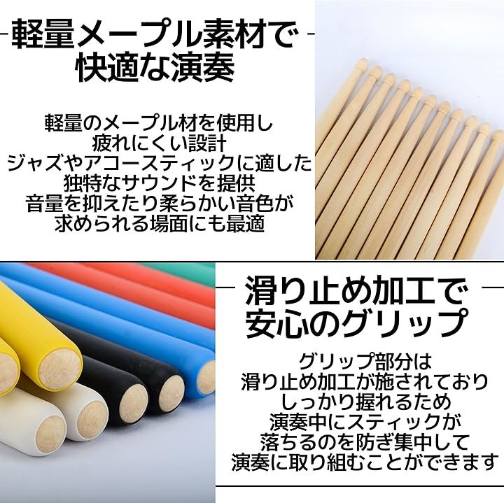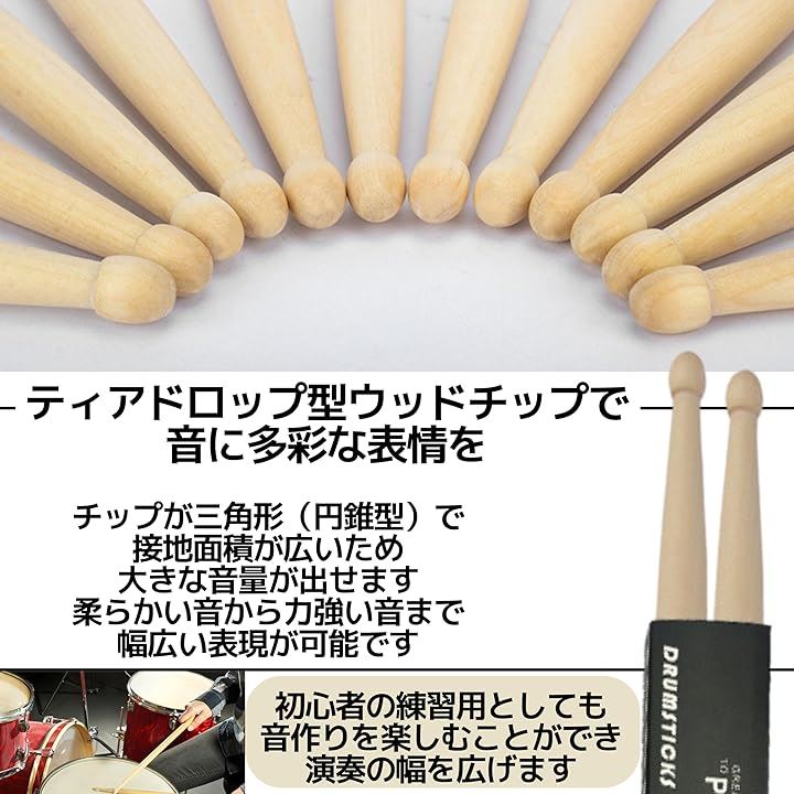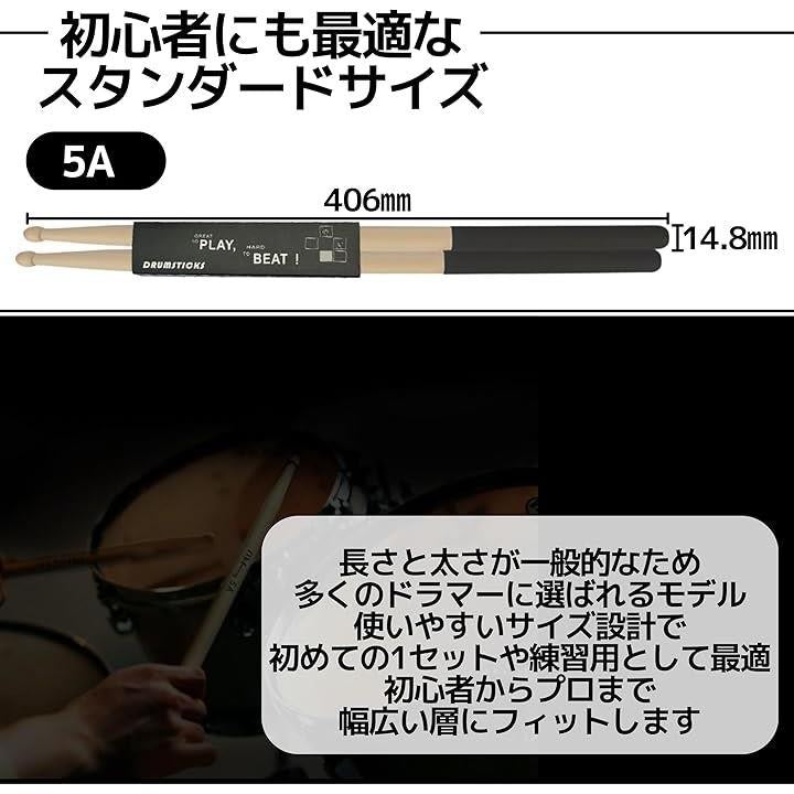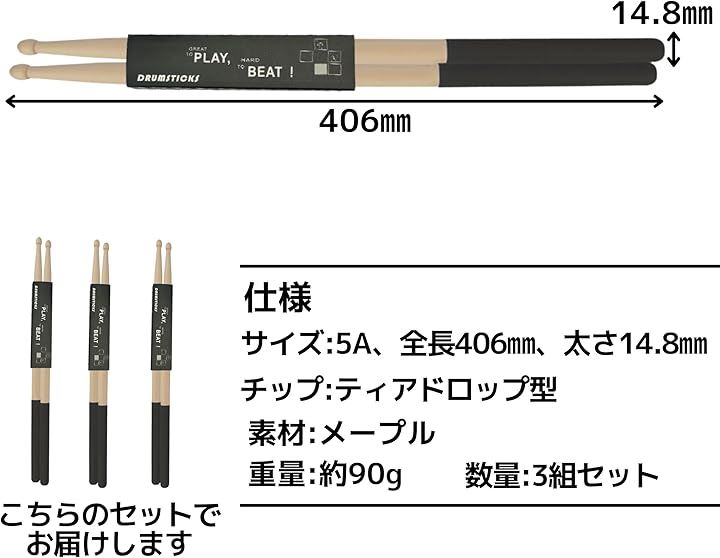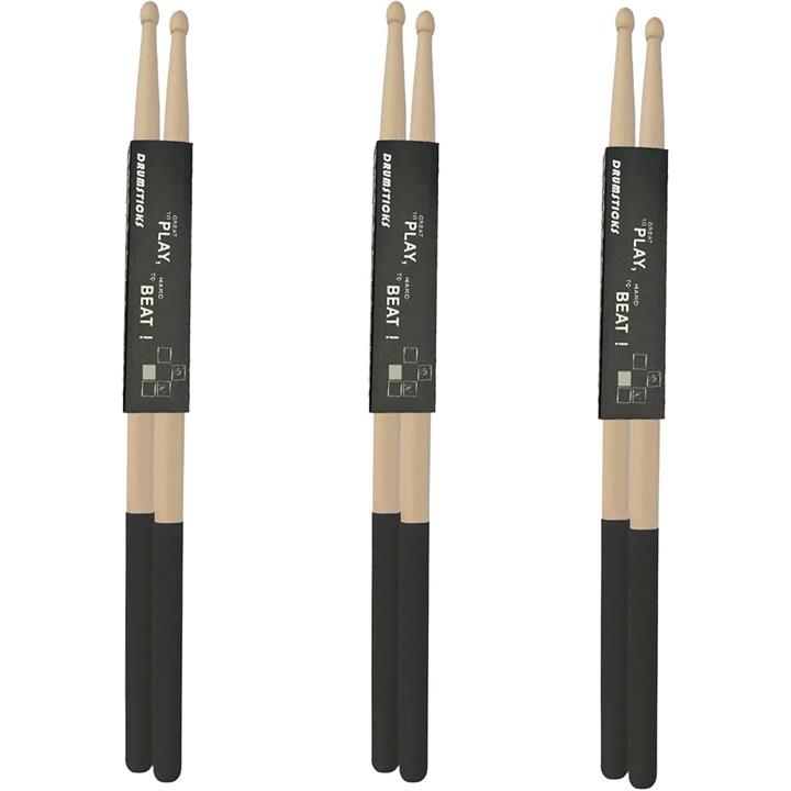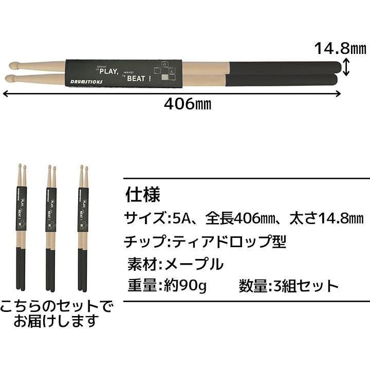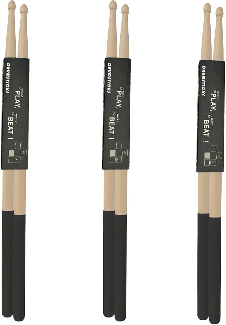 ドラムスティック メープル 滑り止め付き 初心者 練習 5A ウッドチップ ティアドロップ 2本組 3セット 黒