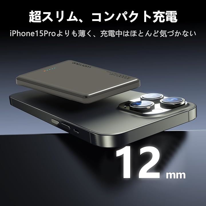 厚さわずか12MMの薄さと、ハイスピード充電を両立させたこのモバイルバッテリーは、スマホを充電しながら重ね持ちできて非常に便利です。