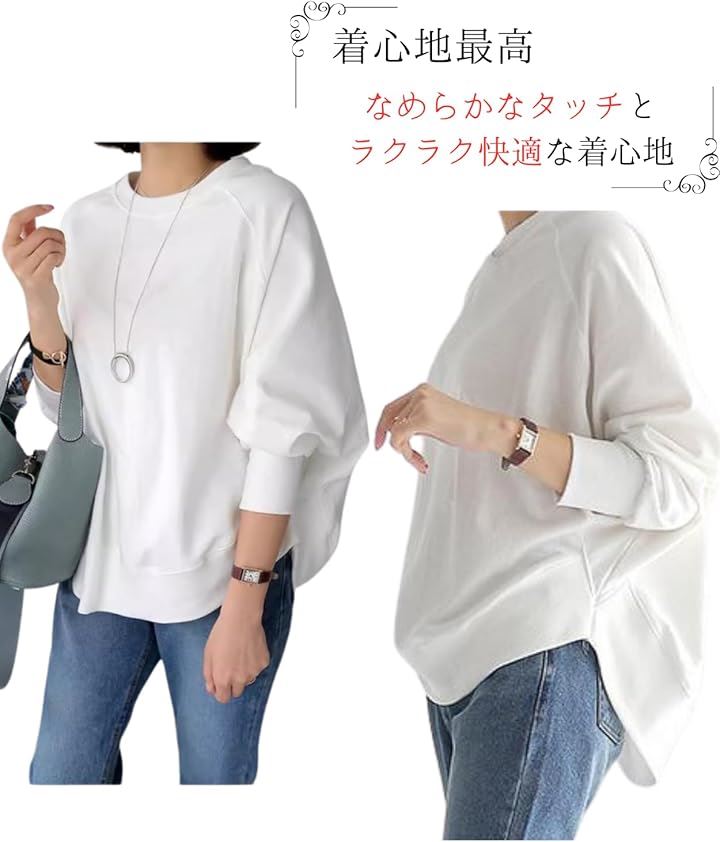 「特徴(1):体型カバーが叶うリラックスシルエット」このトレーナー レディースは、ゆったりとした作りで動きやすく、楽な着心地が魅力。