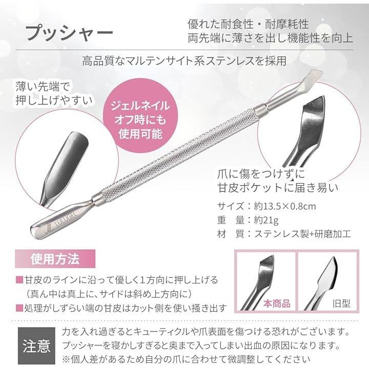 「キューティクルプッシャー」多くのネイリスト達の要望を叶えた形状となっており、かきだす、はぎとる、穿り出す、押し上げるなどの動作が繊細にできる特徴を持つネイル プッシャーです。