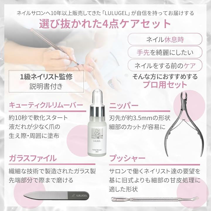 「LULUGEL甘皮処理セットDX」キューティクル・リムーバー20ml、甘皮 ニッパー、メタルプッシャー、爪やすり ガラスが付いた4点セット、ジェルネイル前の下処理をハイクオリティに実現可能、更にネイル休息時や、爪 ケア メンズにも人気のガラスヤスリで爪磨き ピカピカに爪ケアができます。