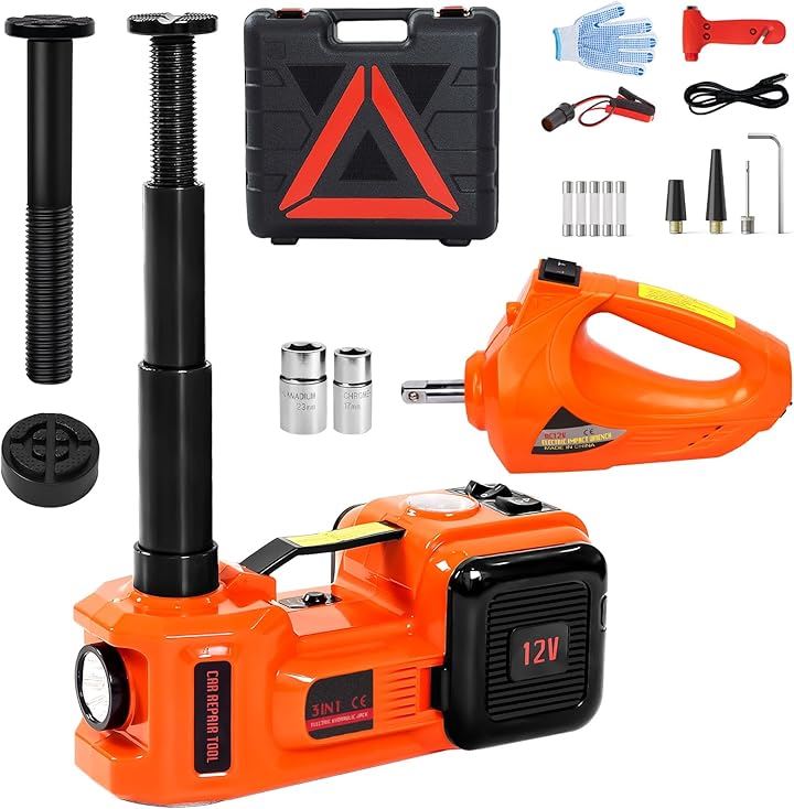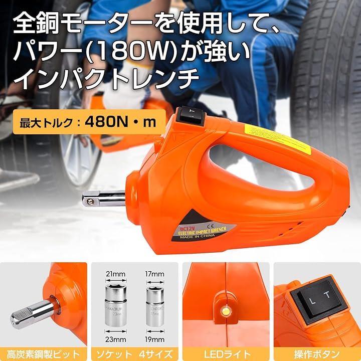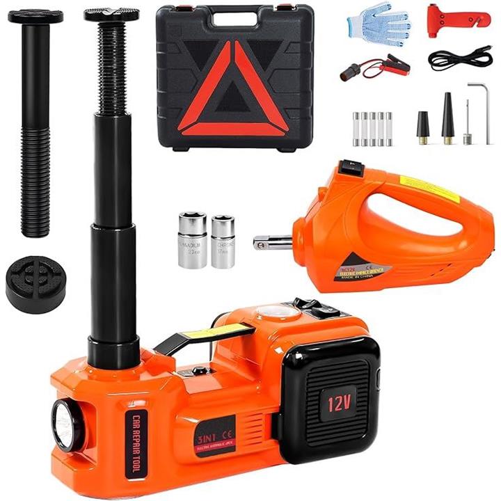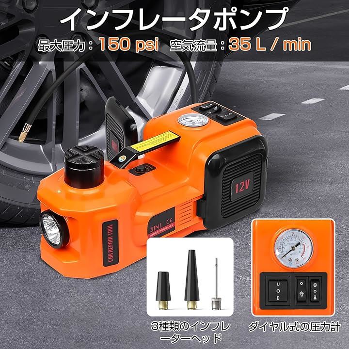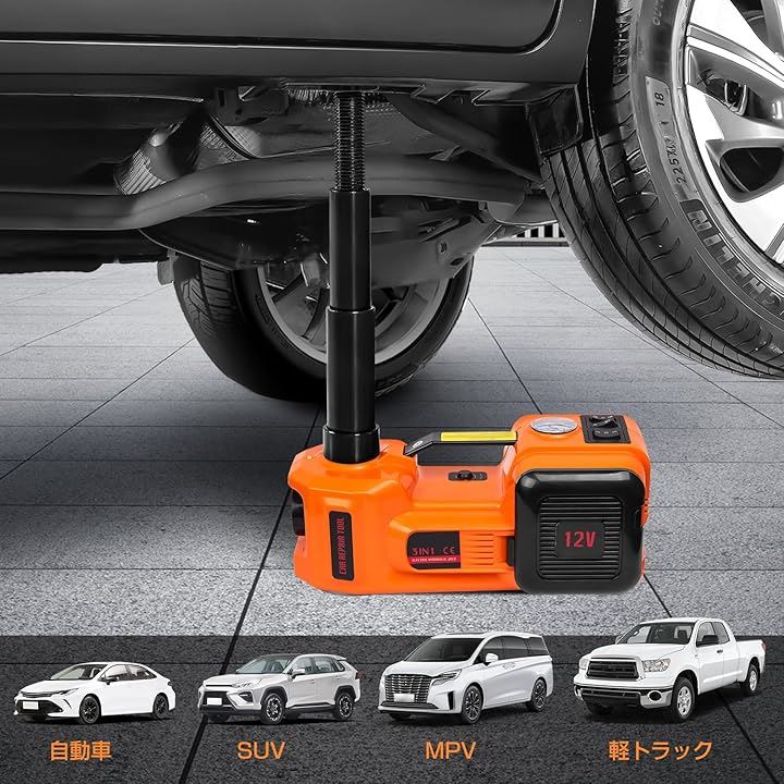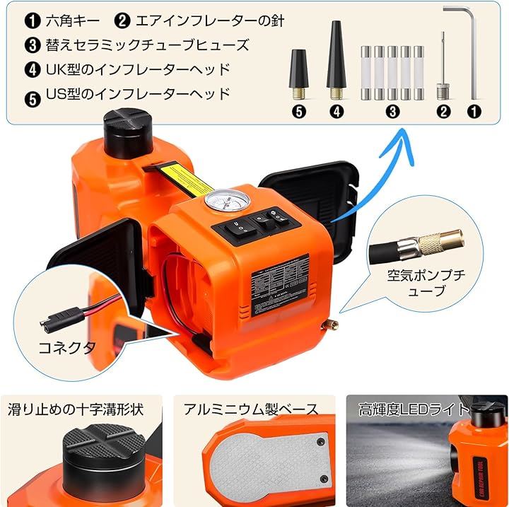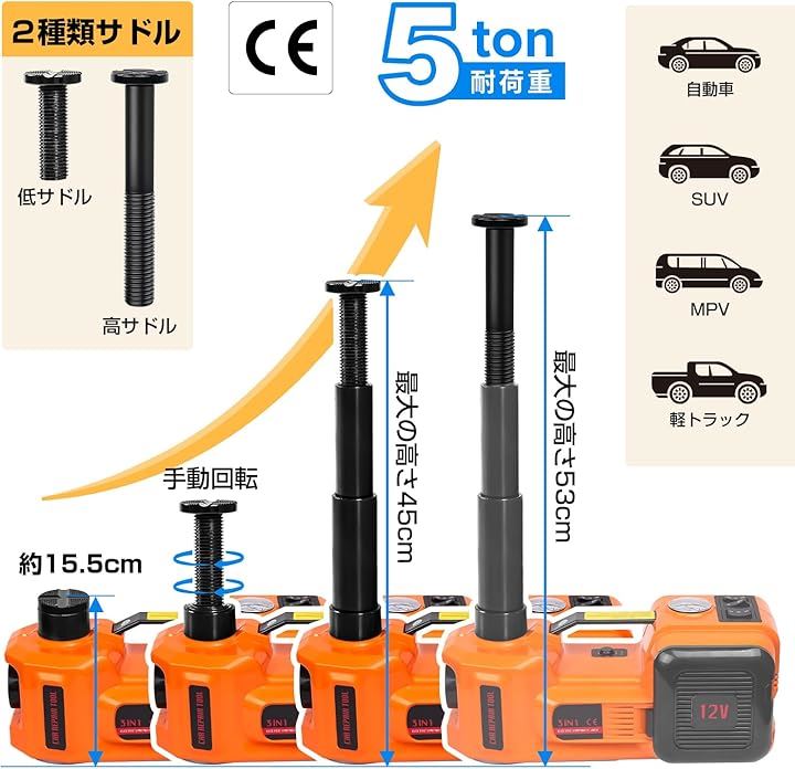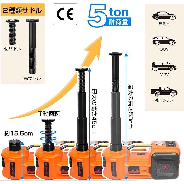 電動ジャッキ 5t 最低位155mm/最高位530mm CE規格 12V 車用ジャッキ 電動油圧ジャッキ 車フロアジャッキ インフレータポンプ機能 サドル2個付き LEDライト付き 収納ケース付き タイヤ交換するツール 自動車/SUV/MPV/軽トラック対応可能 オレンジ