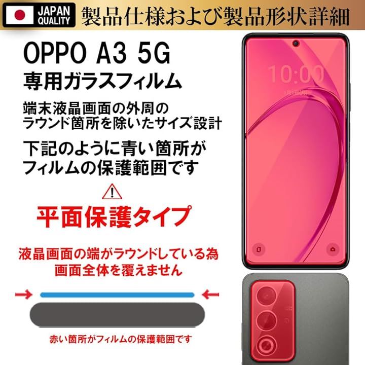 RISE 2枚+2枚 フィルム OPPO A3 5G ガラスフィルム カメラフィルム レンズフィルム レンズ保護ガラス レンズカバー 保護フィルム 強化 高透過 高光沢 日本製 旭硝子 0.26mm 硬度10H 2.5Dラウンドエッジ 自動吸着 気泡ゼロ 飛散防止 指紋防止 撥水撥油